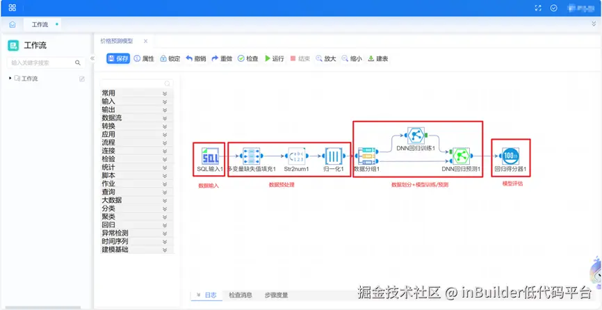 inDataX数据中台将机器学习建模流程清晰划分为四个阶段:数据输入、数据预处理、数据划分与模型训练/预测、模型评估。