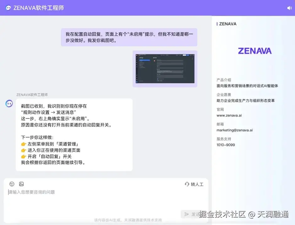 它能理解接口参数、API 调用方式、权限和配置机制等常见技术问题,能够在用户遇到初级故障时给出排查建议,如判断报错类型、定位常见配置问题等。这让原本需要二线、三线技术人员大量介入的基础咨询完全由ZENAVA解决。由此,技术团队得以将精力集中在真正复杂的故障处理、企业级实施和关键客户问题上。