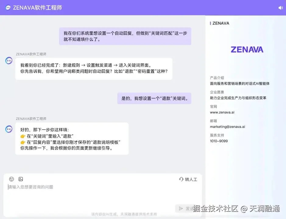 在这样的背景下,ZENAVA 正在帮助软件企业完成一场真正的转变——从“人力驱动”迈向“AI 驱动”,让常规咨询、流程指引和基础技术排查实现自动化,让技术与客服团队重新把时间花在高价值任务上。