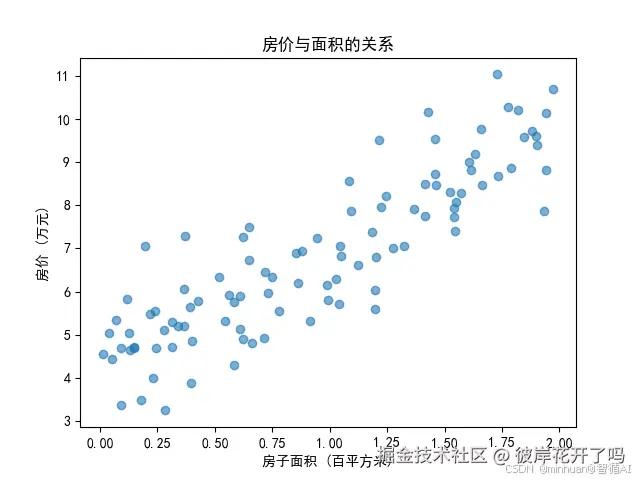 运行这段代码会看到数据点大致分布在一条直线周围,线性回归就是要找到这条最佳拟合直线。