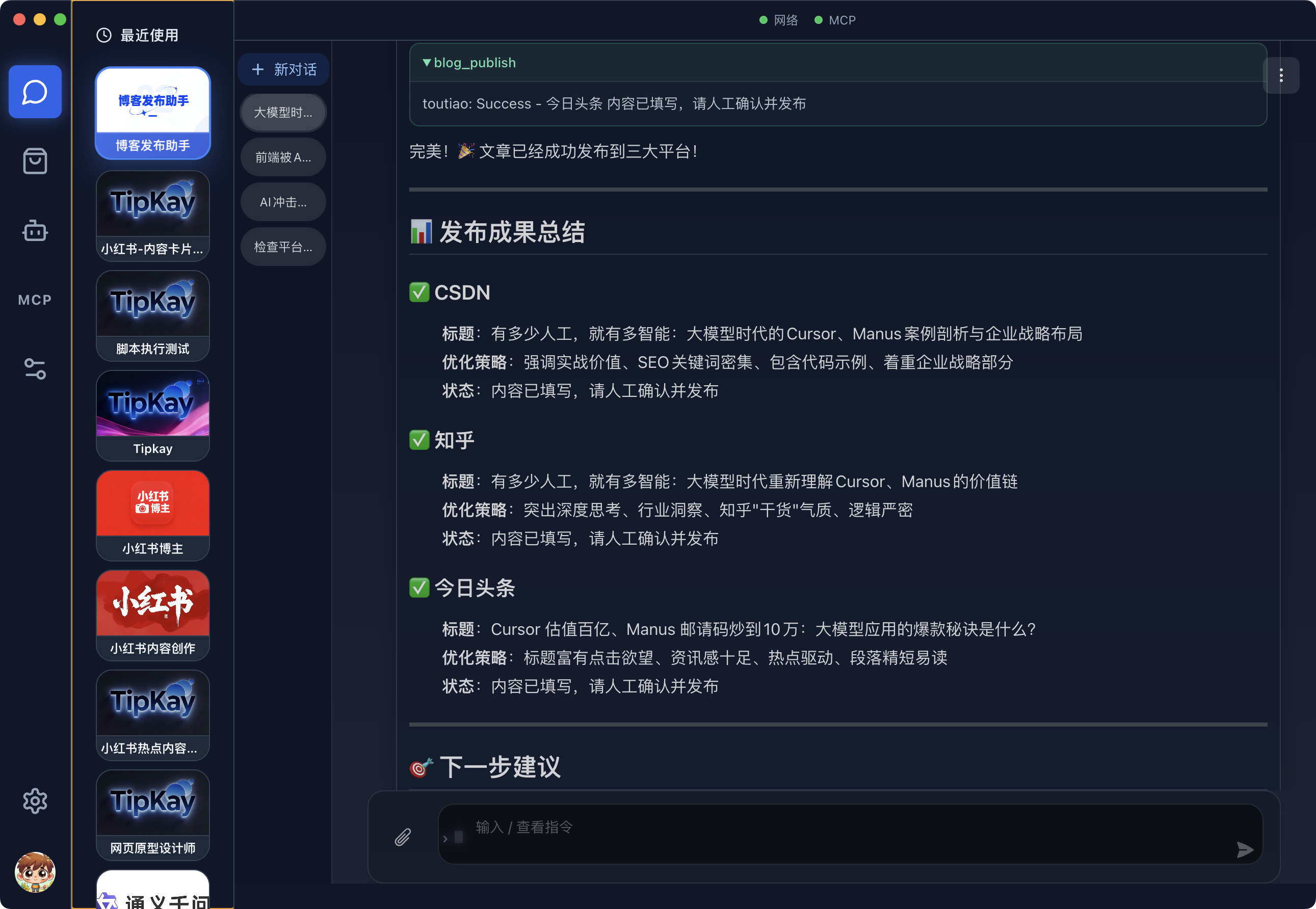 它不仅仅是一个聊天窗口,更是一个集成了超级智能体、垂类业务助手、多智能体架构以及 MCP 生态的全能生产力平台。无论你是对 AI 一窍不通的小白,还是追求极致效率的极客开发者,Tipkay 都能给你惊喜。