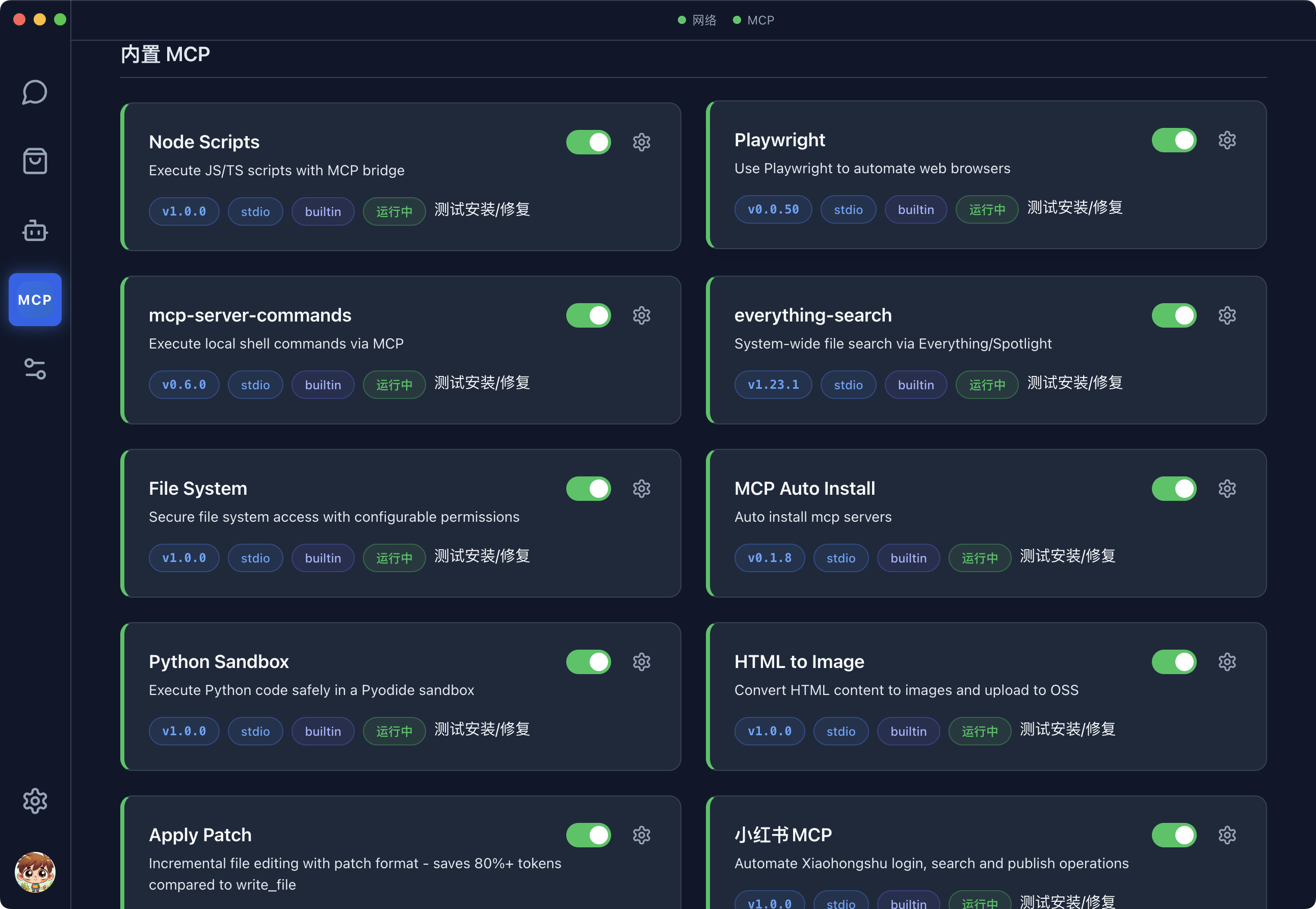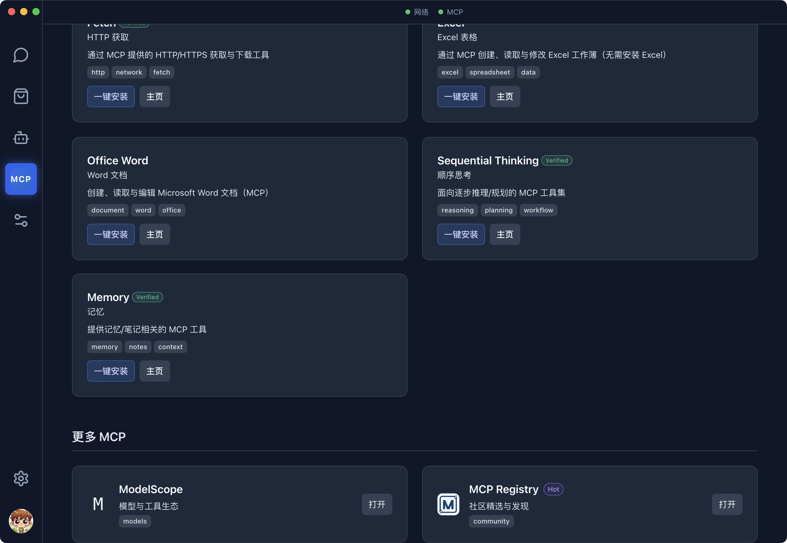 - 一键安装 MCP:内置 MCP 管理中心,想要什么功能(如文件系统访问、网页抓取、数据库连接),直接去管理中心一键安装。你不再需要顶着高延迟去 GitHub 找资源,也不用面对
