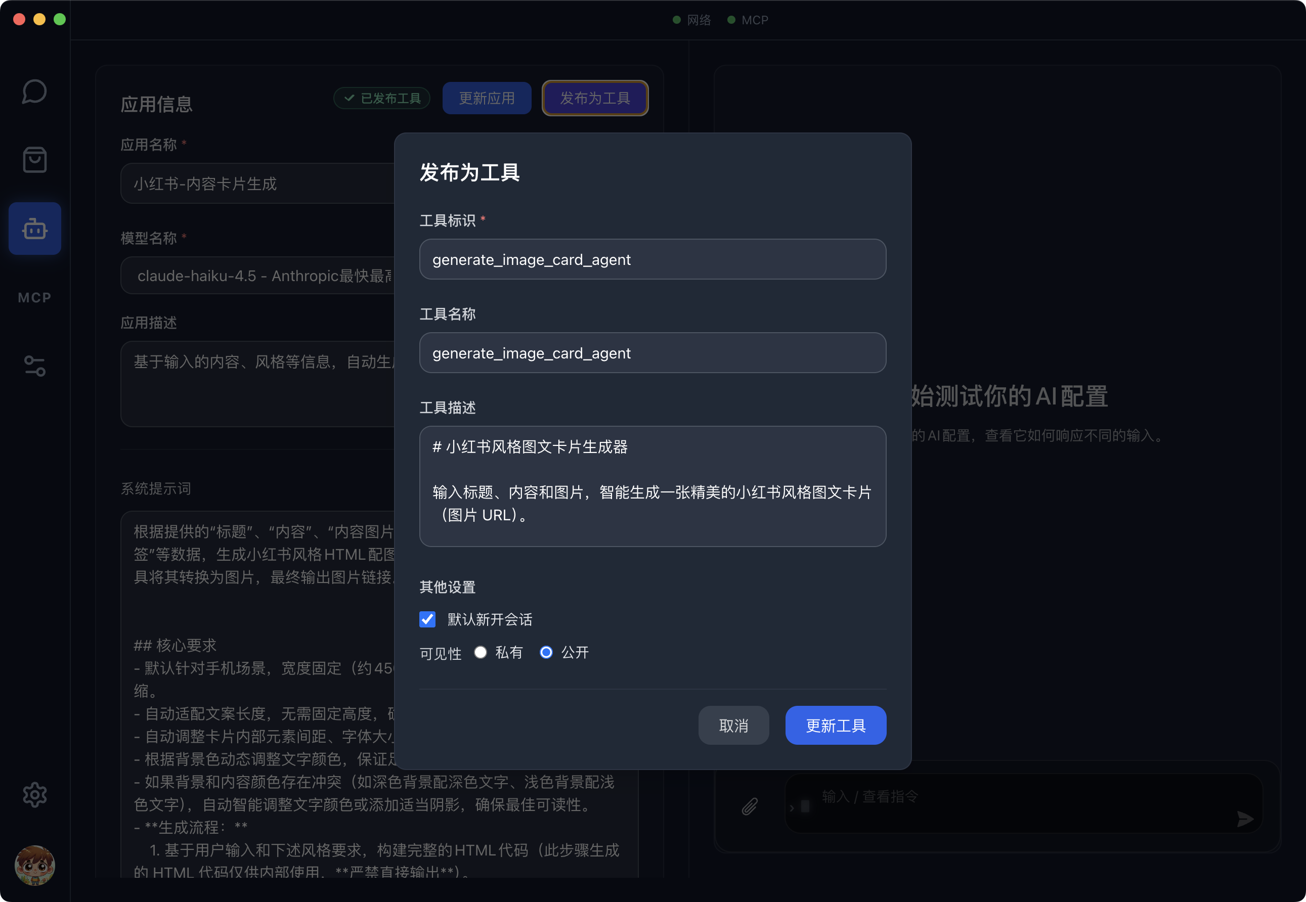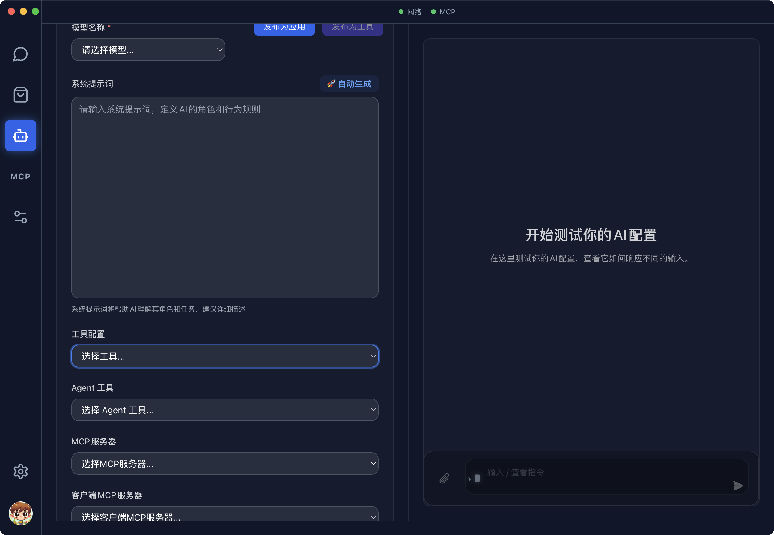 - 配置组装:选择合适的模型,勾选需要的 MCP 工具。