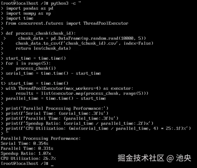 print(f'CPU Utilization: {min(serial_time / parallel_time, 4) * 25:.1f}%')