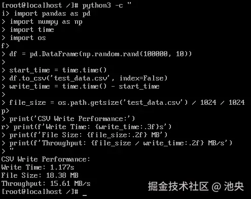 | CSV写入性能 | 15.61 MB/s | I/O调度优化,写入吞吐量优秀 |