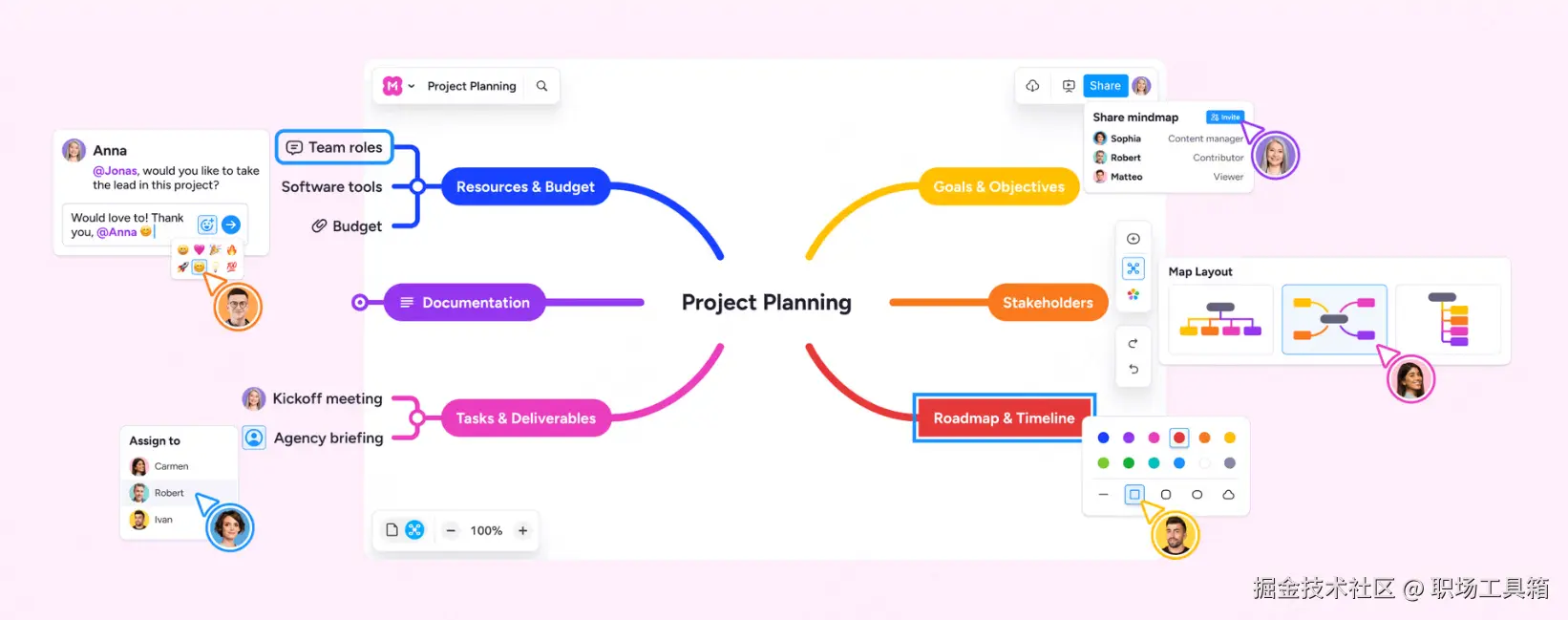 如果你不想在电脑里装乱七八糟的软件,或者只是临时需要记录一下会议纪要,MindMeister 很合适。
