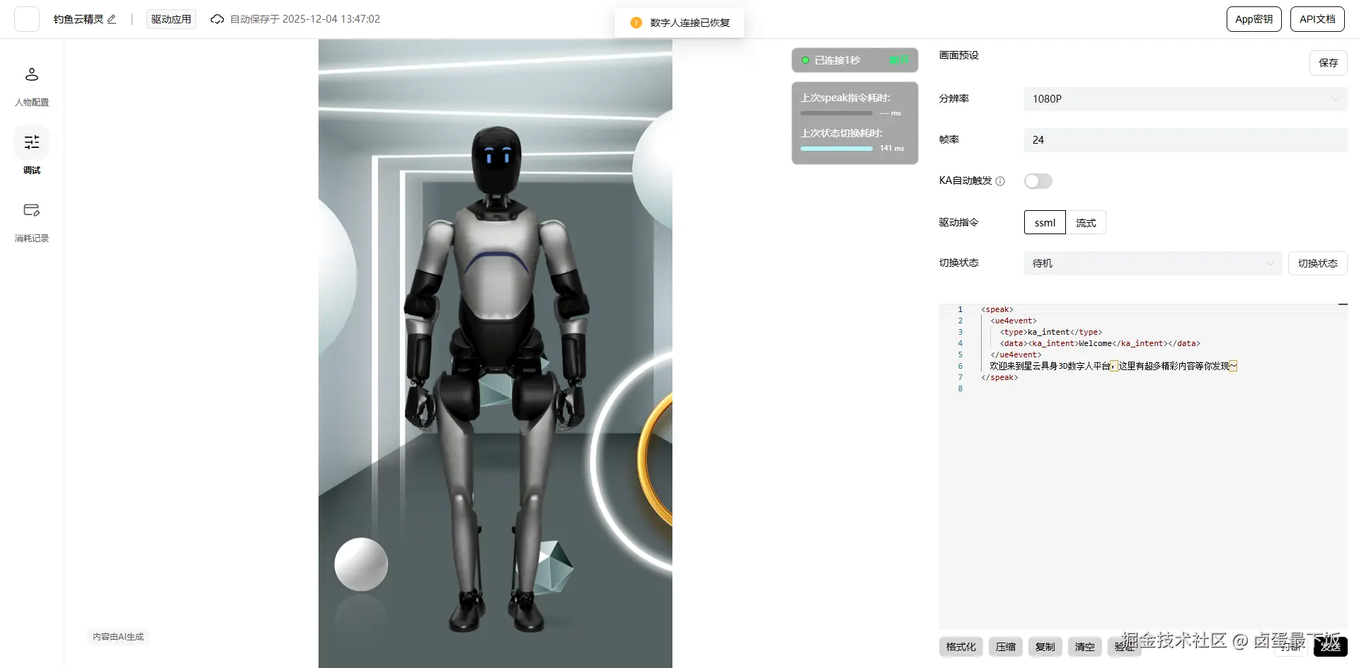 - 进入 “调试面板”,通过模拟指令(如 “来个开场白,简单介绍一下自己”)验证应用响应,实时调整动作流畅度与语义理解精度。整个流程无需复杂代码,10 分钟内即可完成基础应用的搭建。