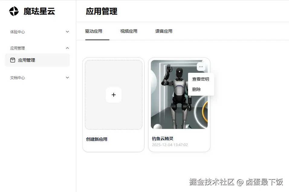 - 进入 “应用管理” 模块,点击 “新建应用”,填写名称与场景标签(如 “钓鱼云精灵”);