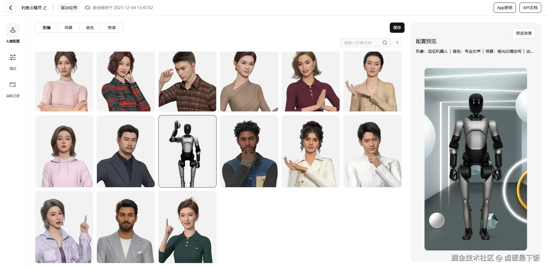 - 在 “配置中心” 的人物配置中,可以选择你想要创建的3D数字人的形象,包括场景、音色、表演等各项配置;