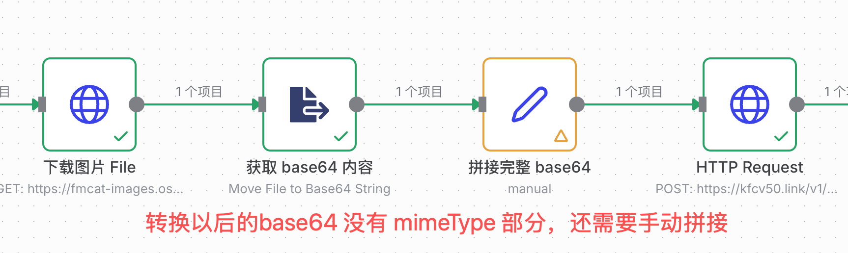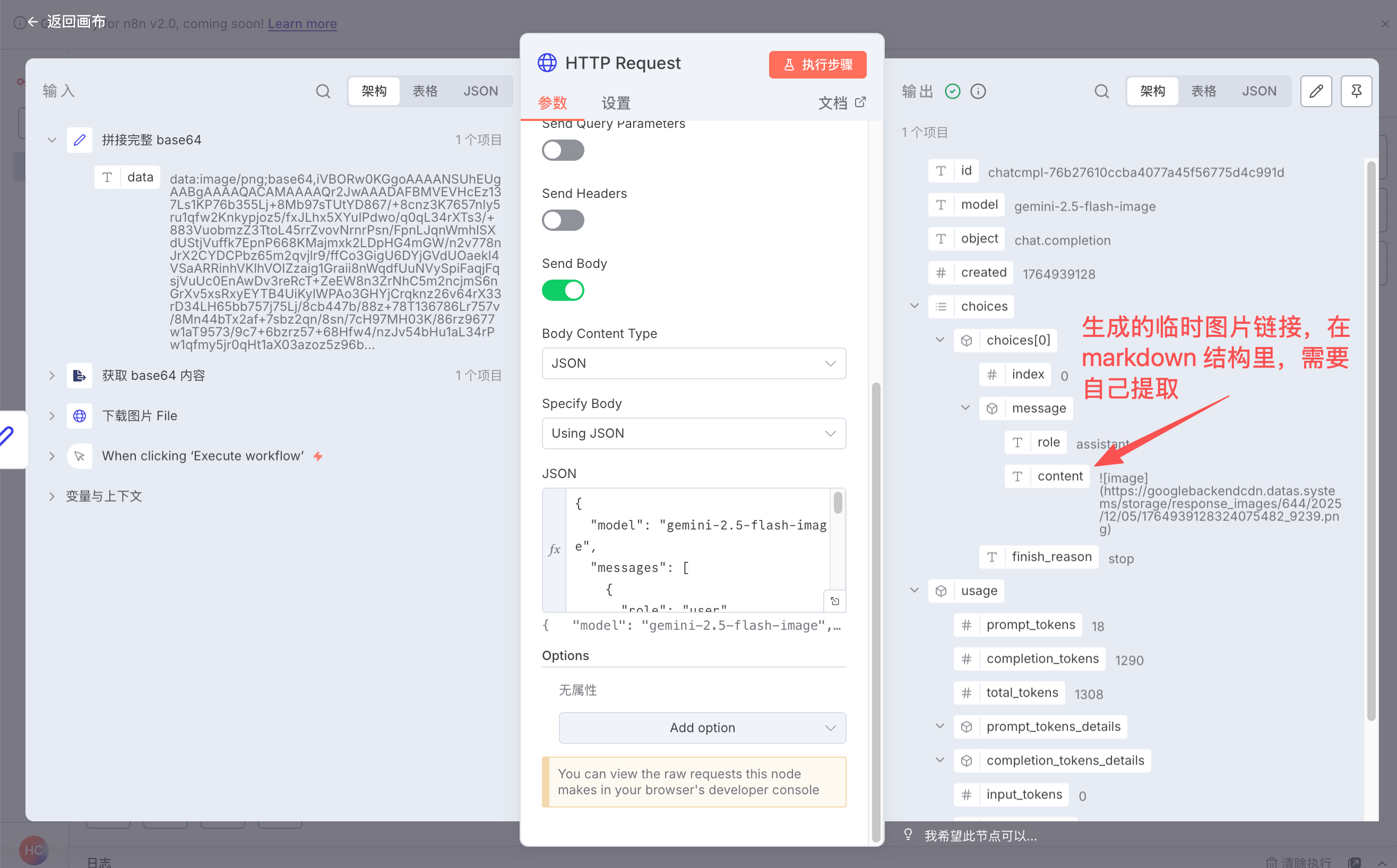 Gemini API 不支持直接传图片链接。你必须先在 n8n 里下载图片,再转成 Base64 编码内容,最后才能拼接到请求参数里。