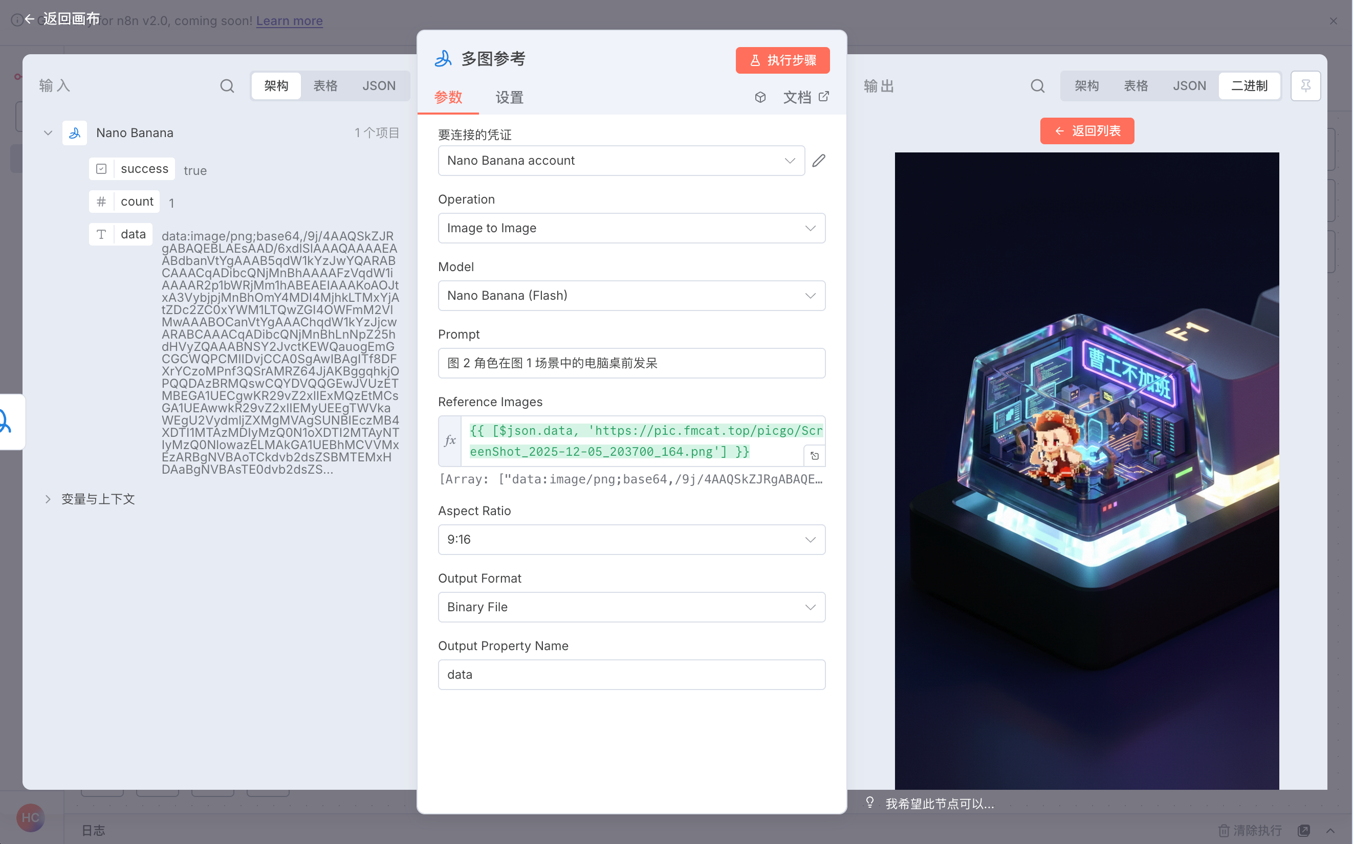 Nano Banana 节点内置了智能预处理逻辑,把“下载-转码-拼接”全在内部做完了。我们把上面这个例子改成输出 base64 内容,给图生图的节点作为参考图,在里面加上另一个角色的参考图。