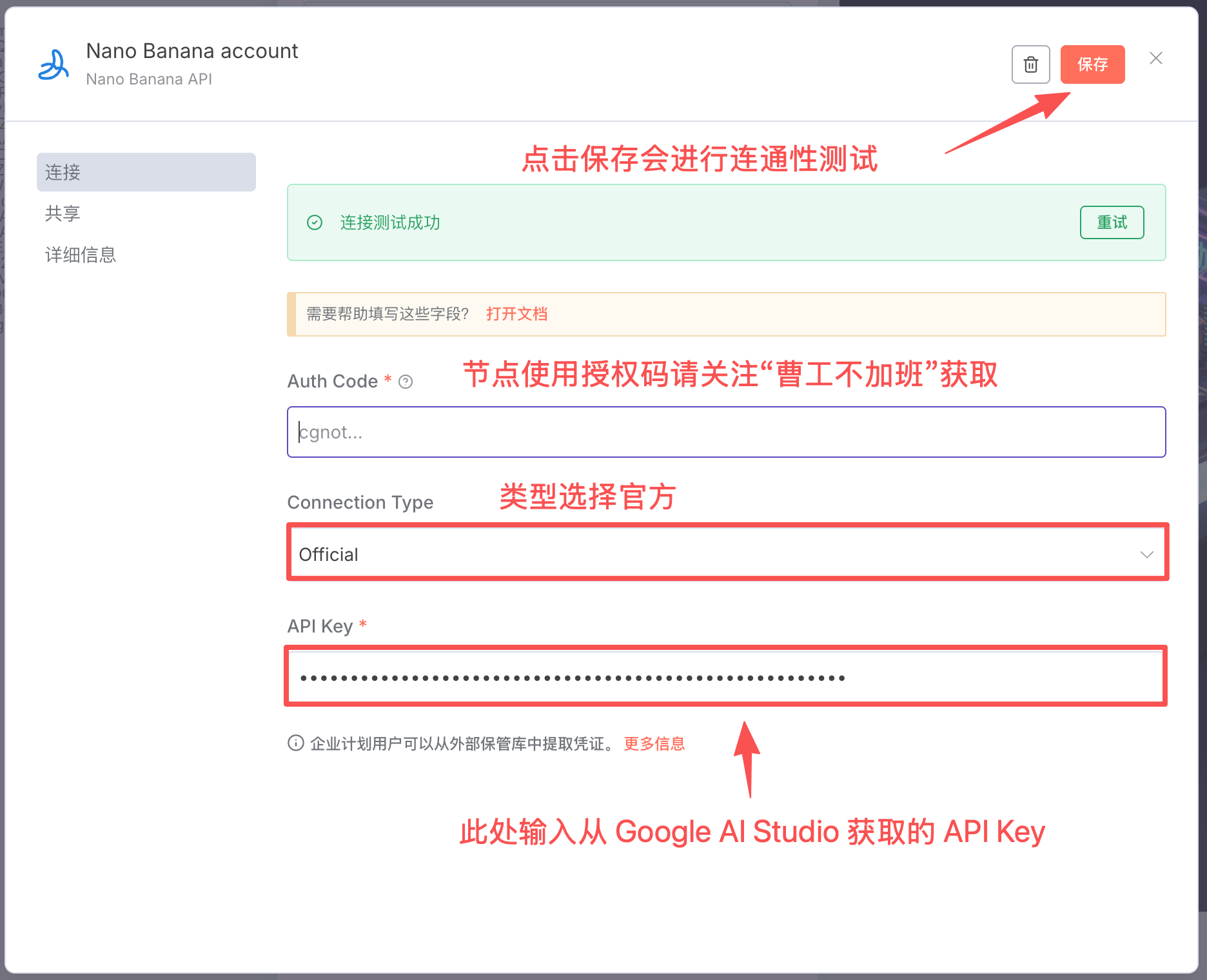 前面只讲了具体调用的参数,使用节点还有最关键的一步是配置调用 API 生成的 key。