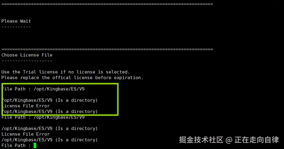 如上图所示,又遇到问题了,芭比Q了,不用慌,这是安装KingbaseES V9时遇到了许可证(license)文件路径的问题。错误信息表明安装程序期望一个具体的license文件,但您提供的 /opt/Kingbase/ES/V9 是一个目录路径。