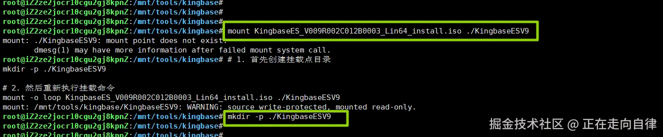 如上图所示,挂载安装包报错了,不用慌,是因为没有创建 KingbaseEsv9目录,创建之后重新执行即可。