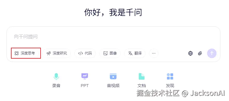 以阿里的千问(www.qianwen.com/chat)举例,开启“深度思考”莫斯,点击输入框的“深度思考”按钮