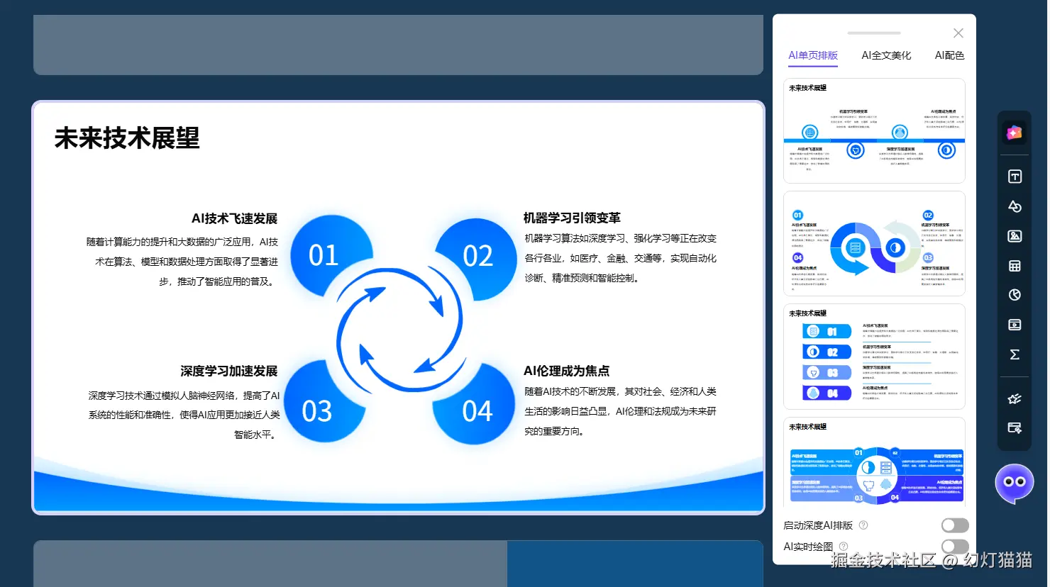 - 选定风格模板:提供“简约大气”、“科技感”、“商务财经”、“中国风”等多种风格,一键适配汇报场景(如对内技术分享、对外产品发布)。