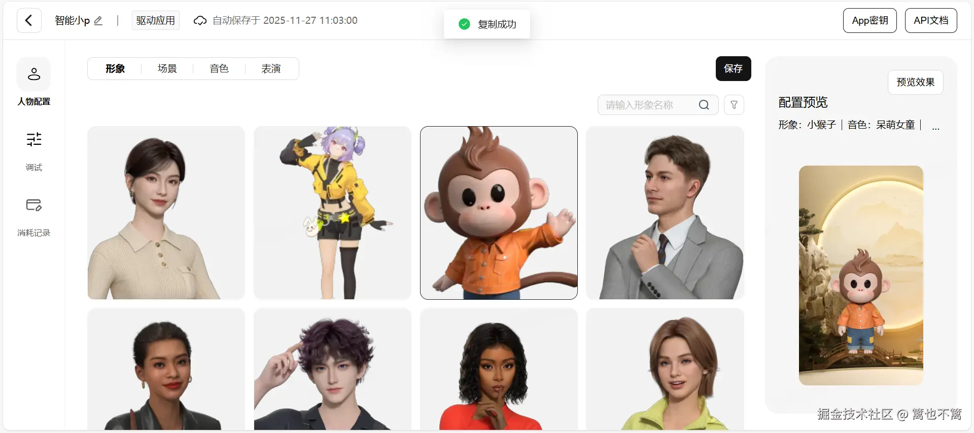 平台内置了多种高精度的3D角色库,涵盖超写实、二次元、卡通、美型等多样角色风格。根据应用场景选择合适的角色。