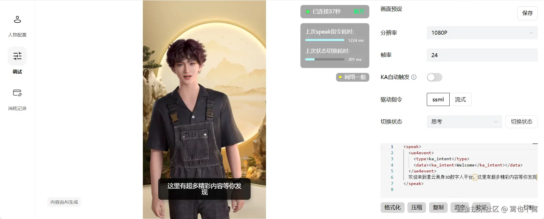 进入"调试"面板,在右侧代码框中输入指令,测试数字人的渲染效果。例如,输入一段开场白,观察数字人的语音、表情、手势是否自然流畅。