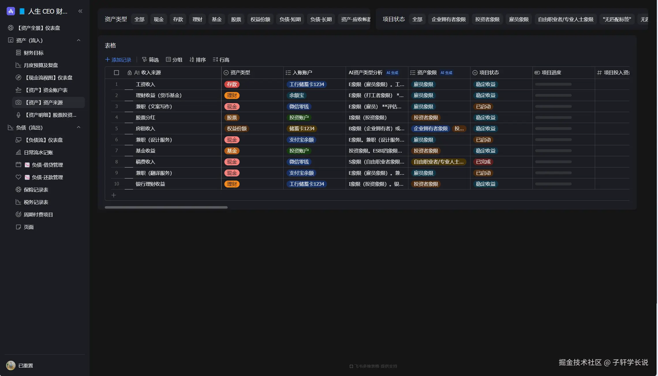 我最近在搭个人财务管理系统,多维表格里记了收入、支出、账单日期、还款提醒这些字段,子表还分了“日常开销”“信用卡账单”“投资记录”。