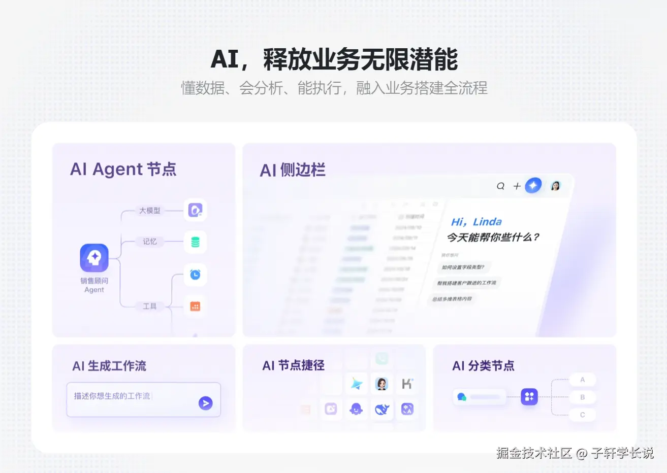 之前想弄个“账单到期前自动发提醒”的工作流,人工操作得选触发条件(日期字段)、关联子表数据(用户姓名、金额)、设置执行动作(发飞书消息), 好多工作流的话,重复性工作还是挺多的。