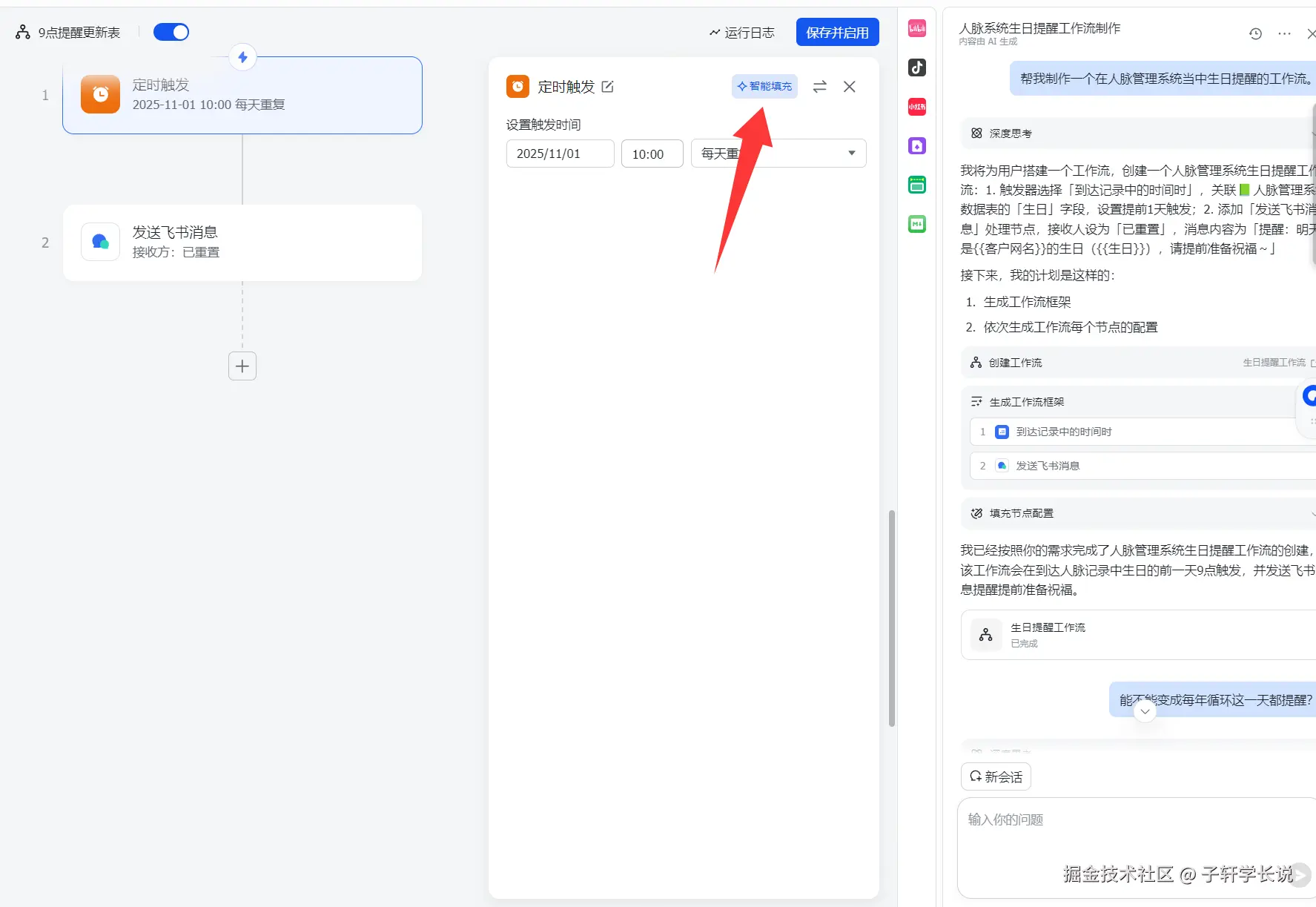结果这次点开多维表格右侧右上角那个“AI助手”小图标,输了句“帮我生成一个账单到期前3天自动发提醒的工作流”,AI直接“活”了——
