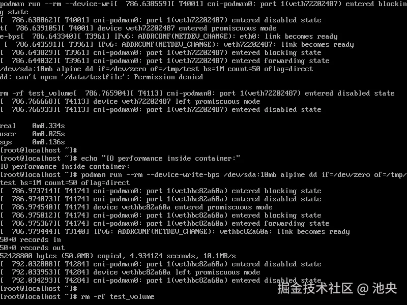 time podman run --rm -v $(pwd)/test_volume:/data alpine dd if=/dev/zero of=/data/testfile bs=1M count=100