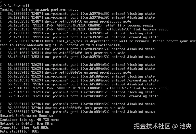 在存储性能测试中,卷挂载写入速度达到299.4MB/s,体现了overlay2存储驱动在openEuler上的深度优化。这种高性能的存储支持为数据库容器、文件服务等IO密集型应用提供了坚实基础。