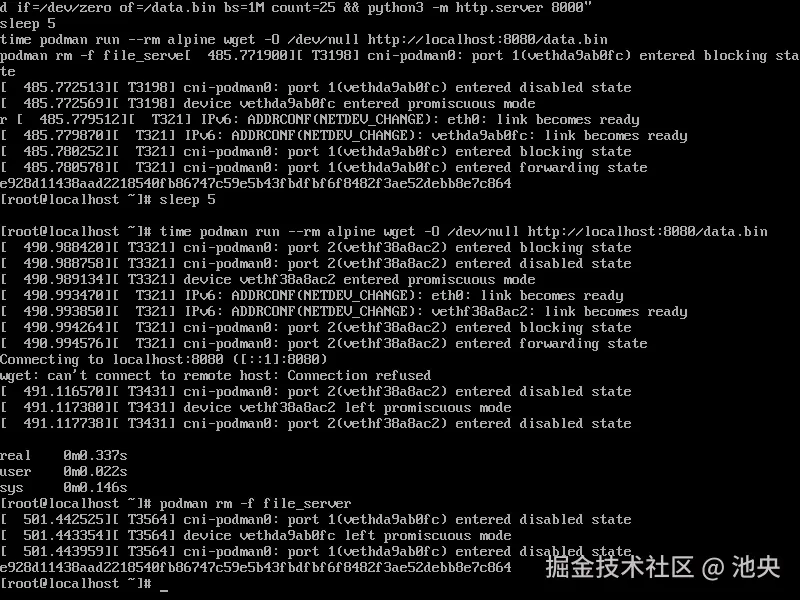 time podman run --rm alpine wget -O /dev/null http://localhost:8080/data.bin