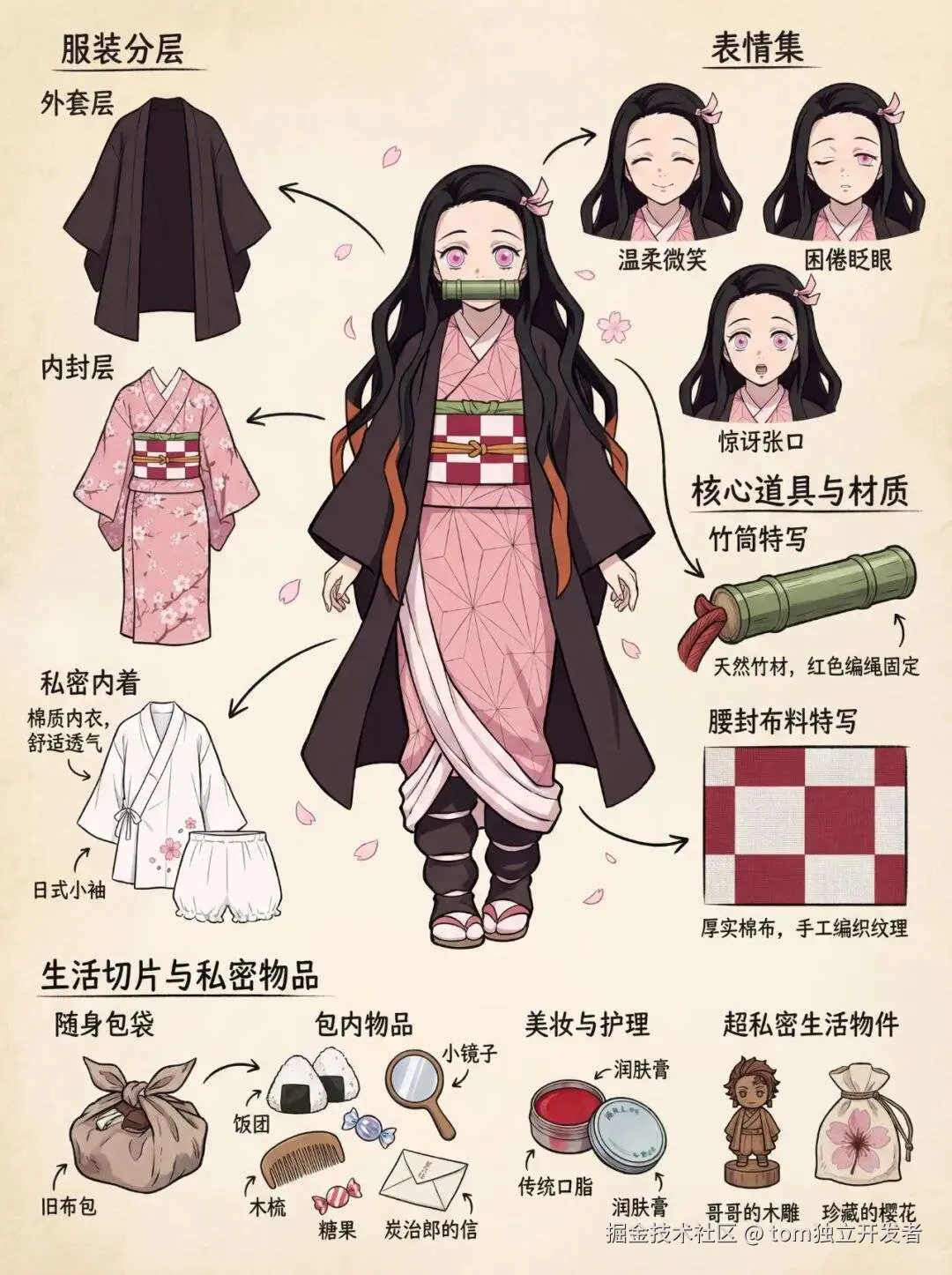 根据用户上传或描述的主体形象,生成一张“全景式角色深度概念分解图”。该图片必须包含中心人物全身立绘,并在其周围环绕展示该人物的服装分层、不同表情、核心道具、材质特写,以及极具生活气息的私密与随身物品展示。