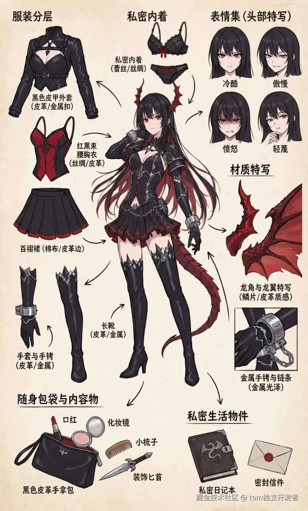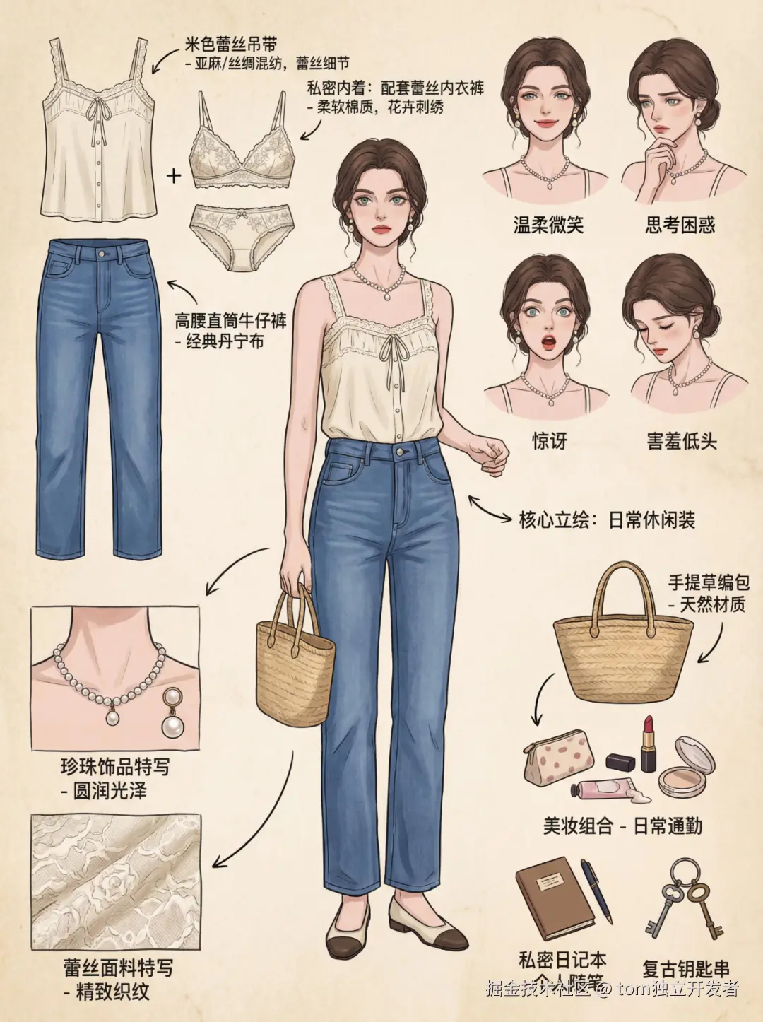 - 脑补并设计二级深度元素(内衣风格?包里会有什么私密物品?)。