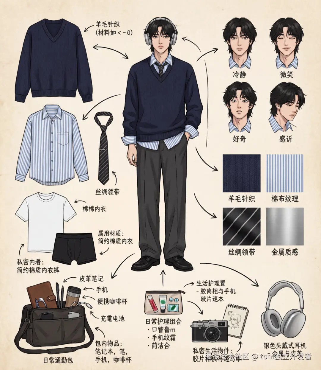 • 随身包袋与内容物 : 绘制角色的日常通勤包或手拿包,并将其“打开”,展示散落在旁的物品,符合其职业、爱好、性格和生活习惯的个人物品。