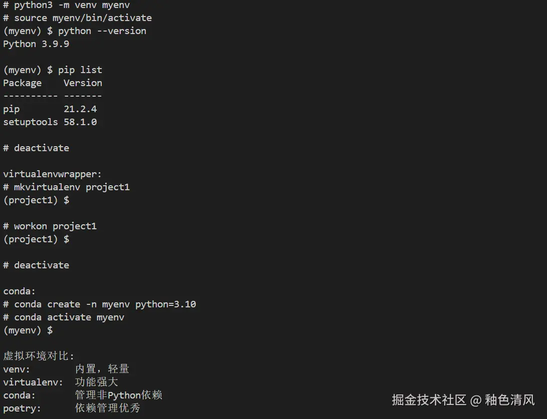 | venv | 内置,轻量 | 功能简单 | 简单项目 |