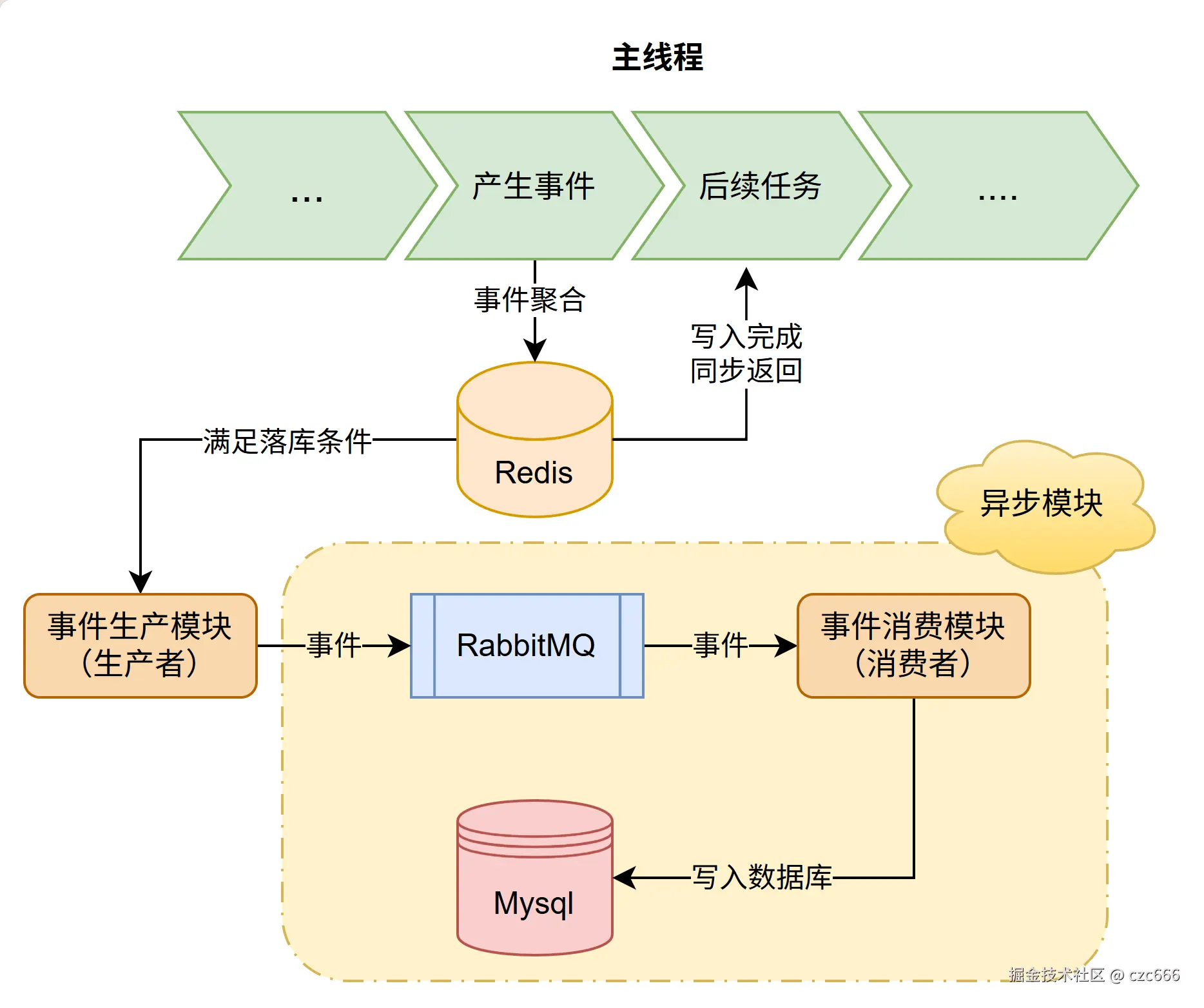首先主线程执行到事件产生的代码,这时候需要先把事件暂存到Redis,也就是完成聚合操作,然后就可以同步返回继续执行,在过程中需要判断是否满足落库条件,满足的话由事件产生模块封装好时间发送给消息队列,后续就不用管了,由消息队列另一端的消费模块来处理落库任务。