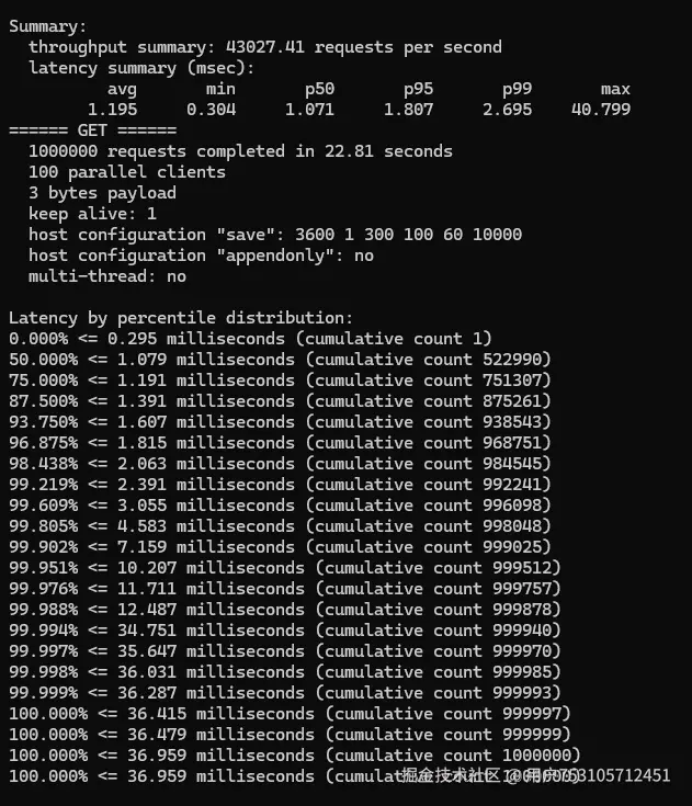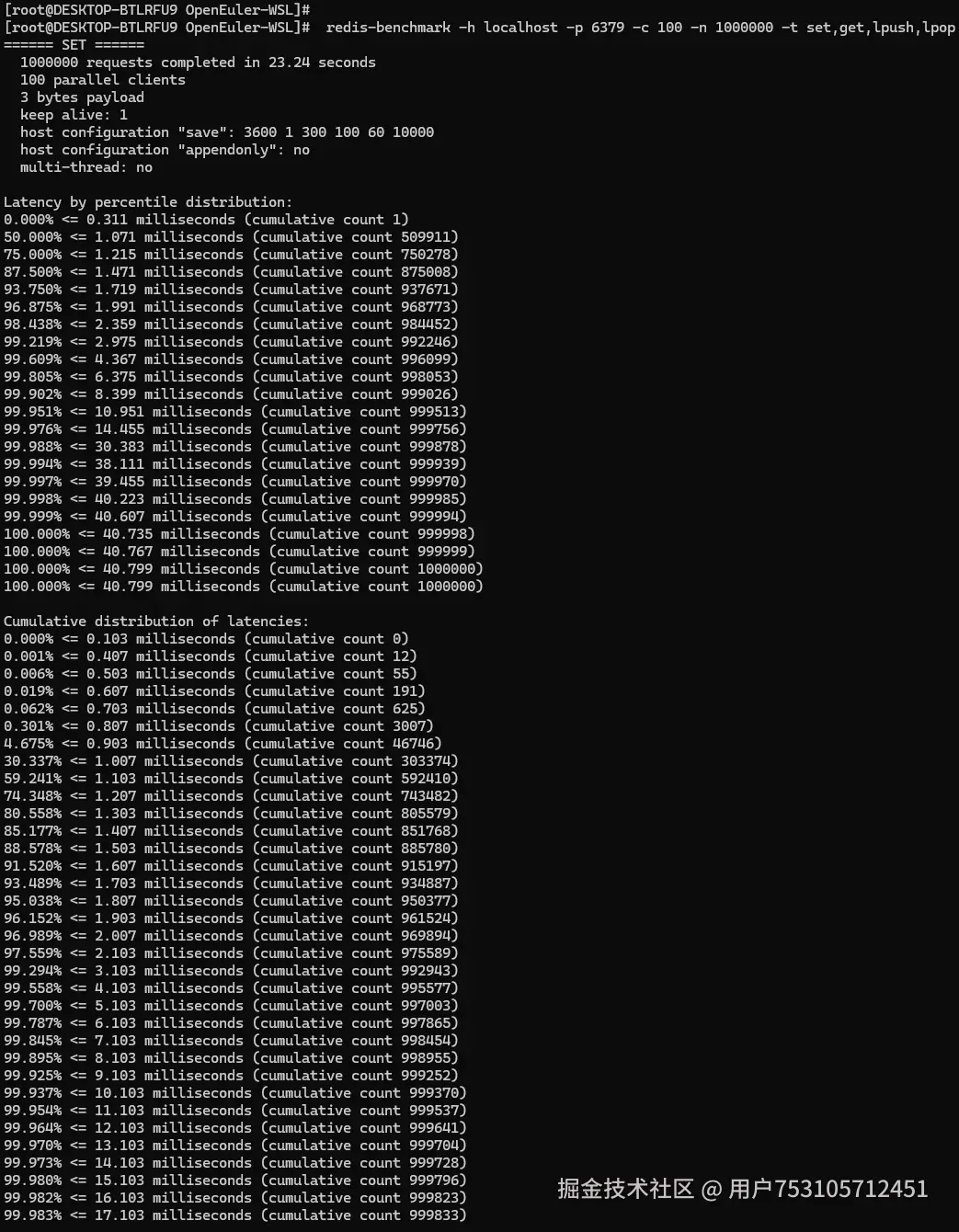redis-benchmark -h localhost -p 6379 -c 100 -n 1000000 -t set,get,lpush,lpop