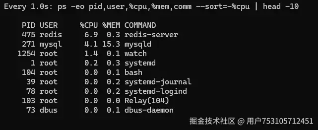 watch -n 1 'ps -eo pid,user,%cpu,%mem,comm --sort=-%cpu | head -10'