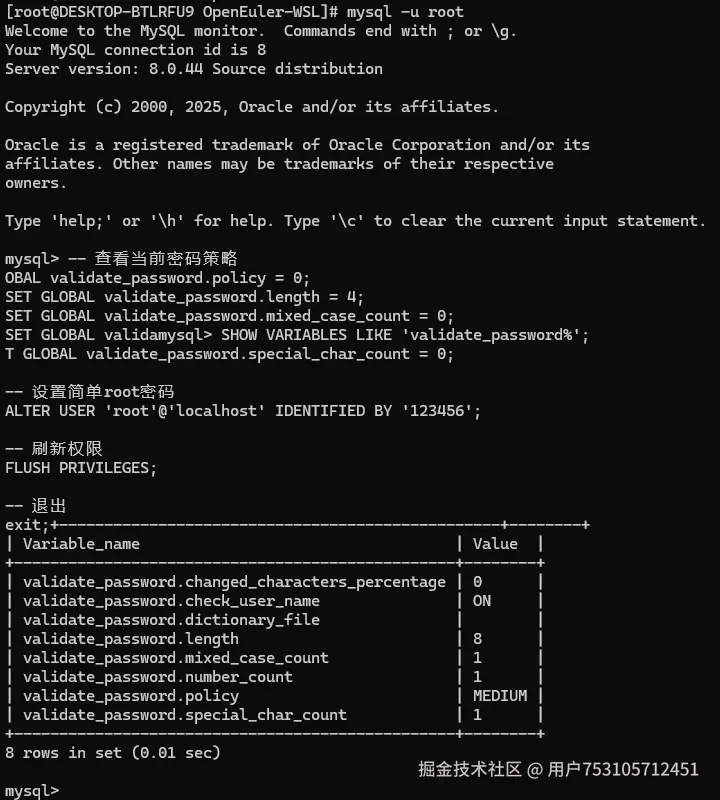 在MySQL命令行中执行以下SQL来禁用密码策略: