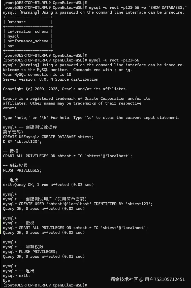 mysql -u root -p123456 -e "CREATE DATABASE IF NOT EXISTS sbtest;"