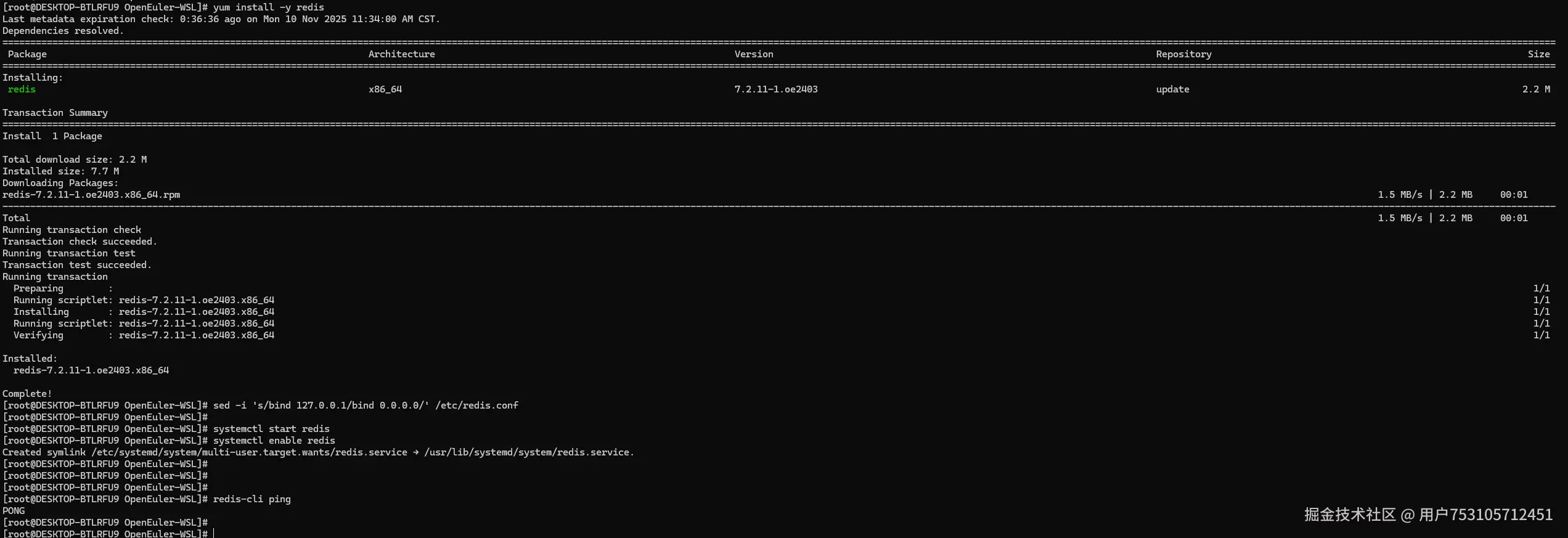 openEuler官方源已适配Redis,采用yum安装实现快速部署: