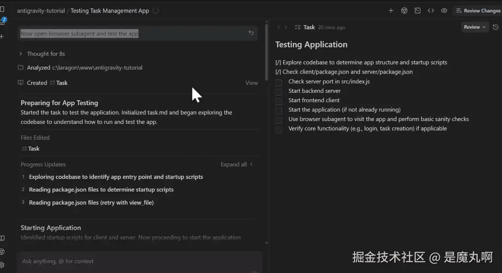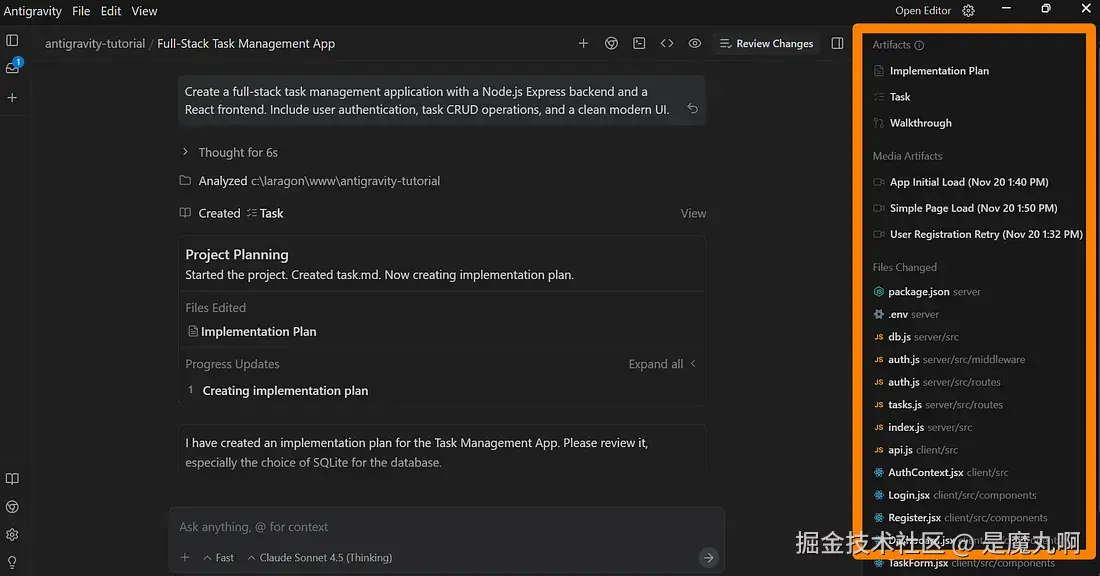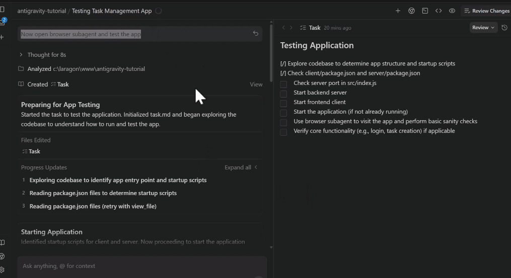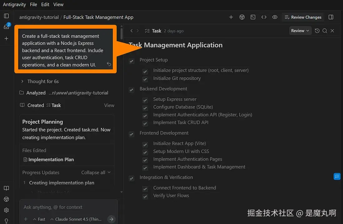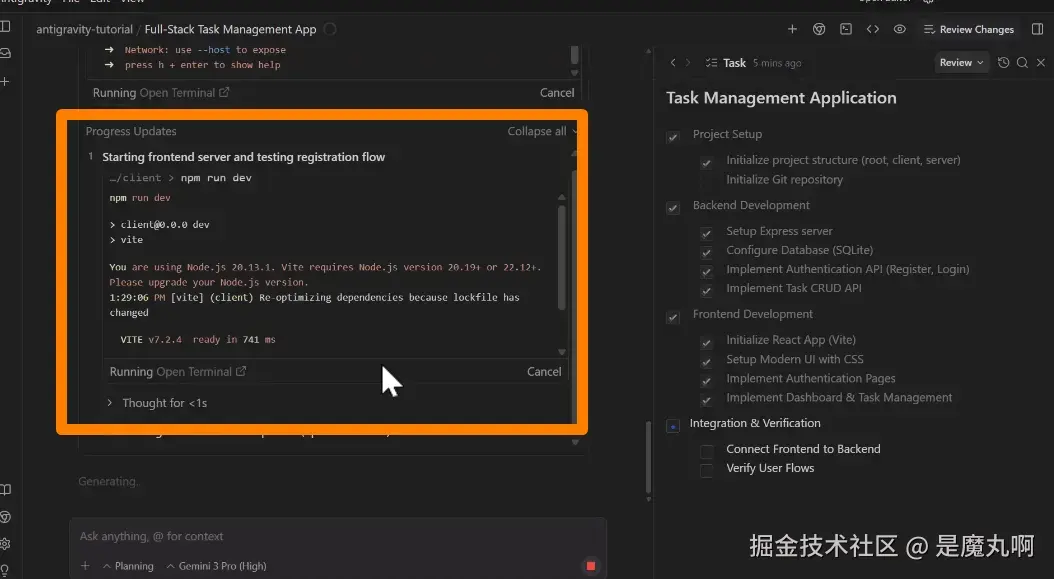 我要求 Antigravity 用 Node.js 后端和 React 前端构建一个任务管理应用程序。