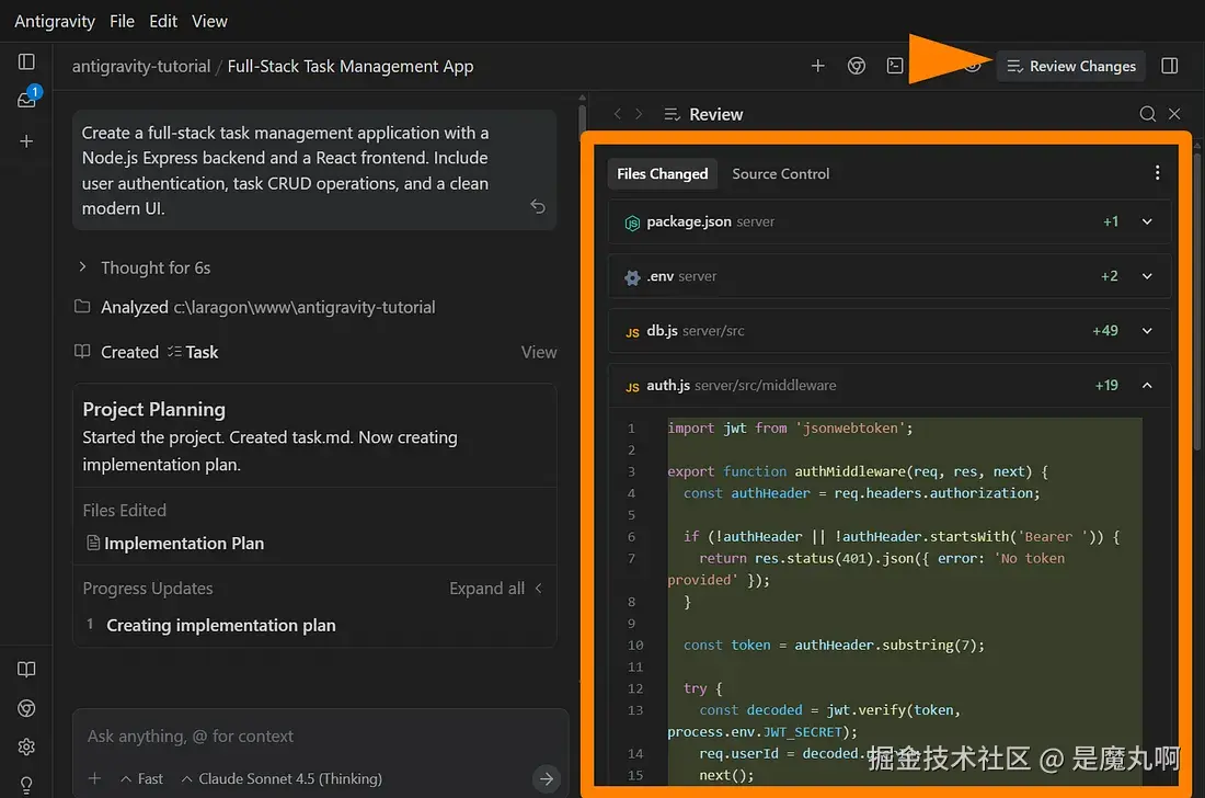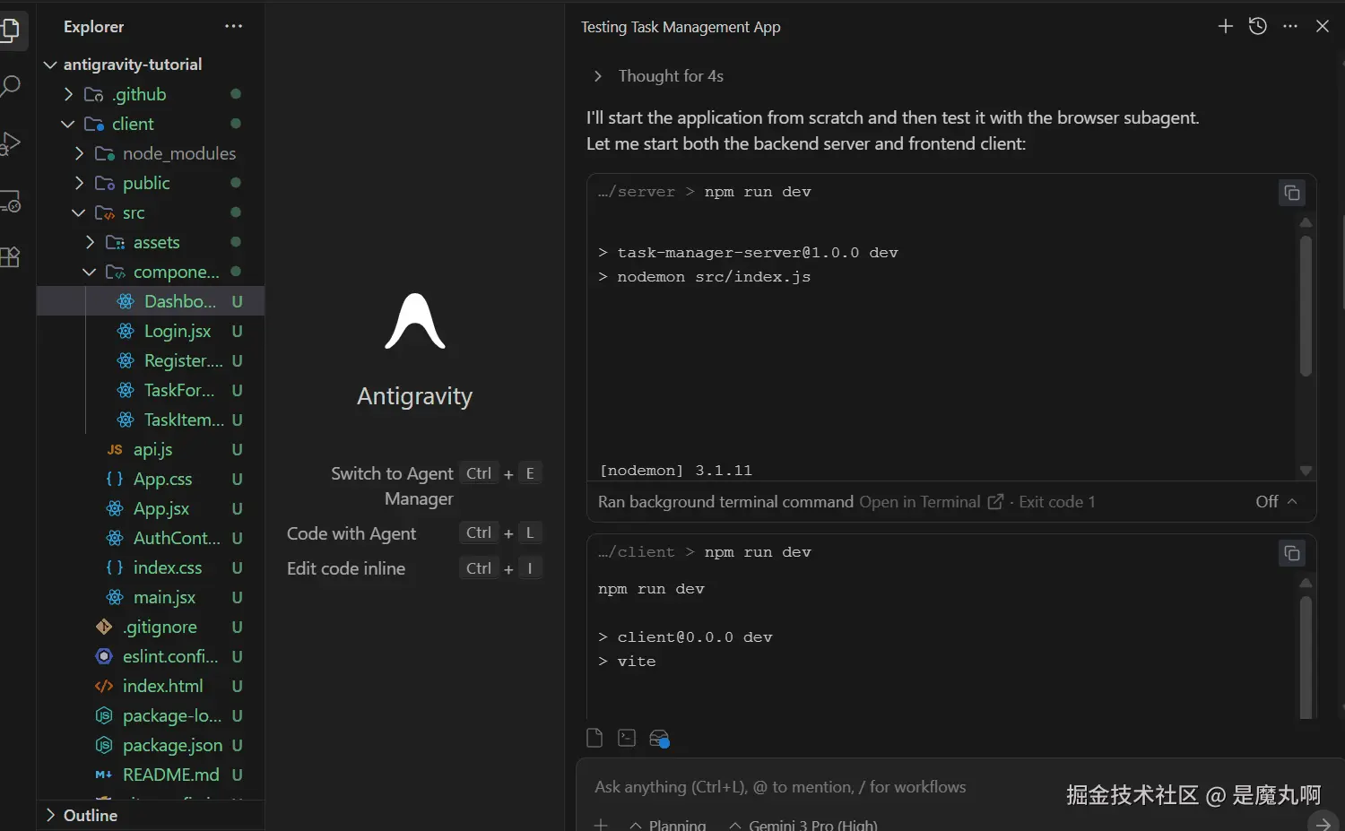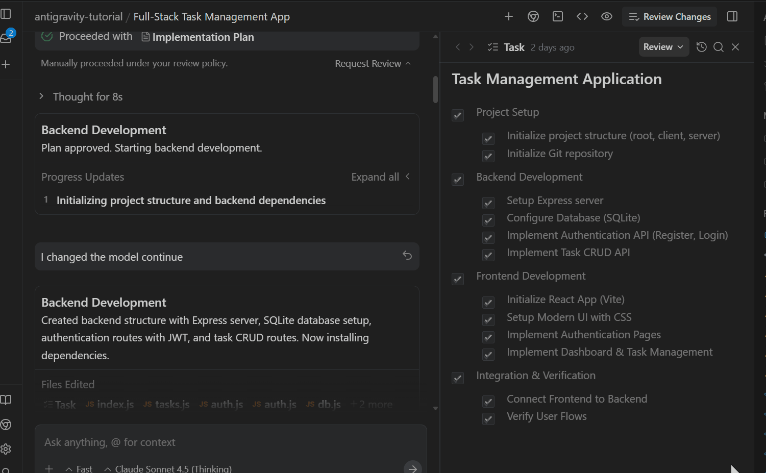 我要求 Antigravity 用 Node.js 后端和 React 前端构建一个任务管理应用程序。