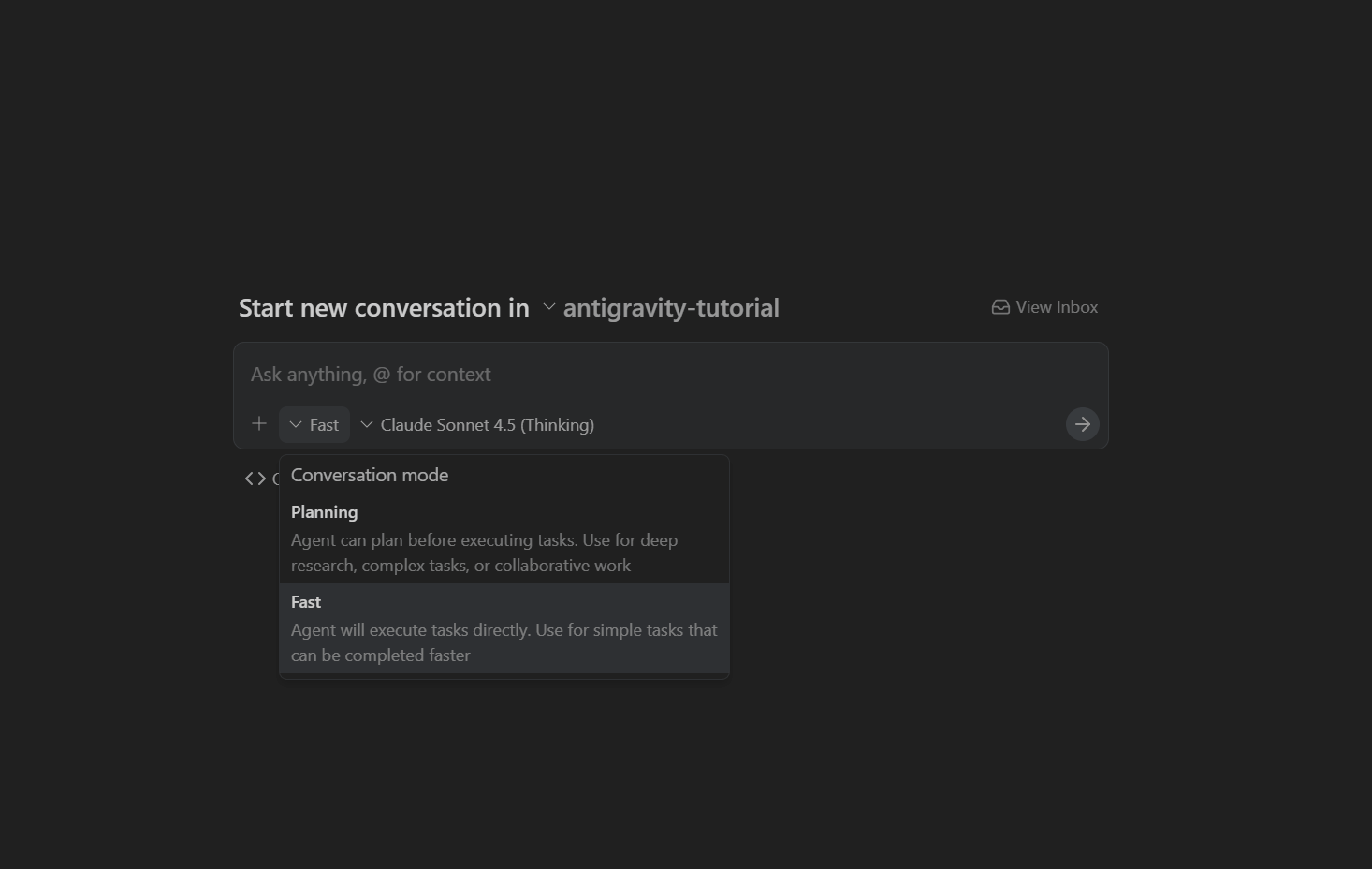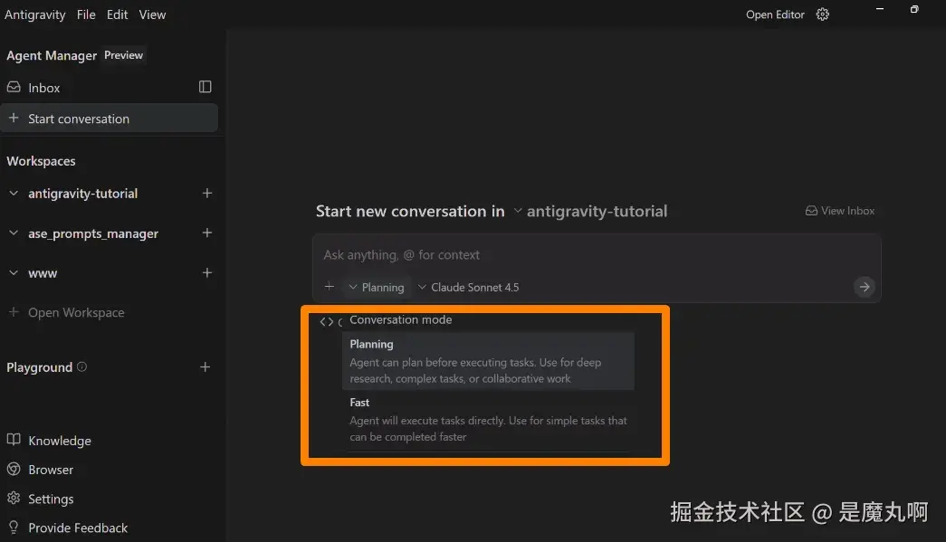 当你在 Antigravity 中开始新的代理对话时,你选择你的模式: