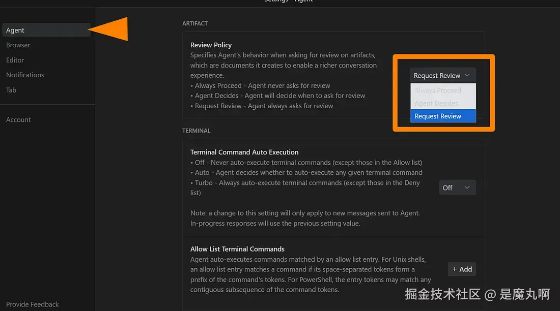 Antigravity 让你控制代理请求许可的程度。