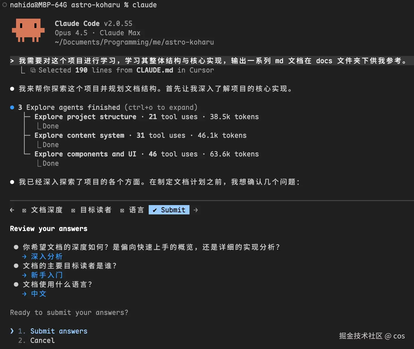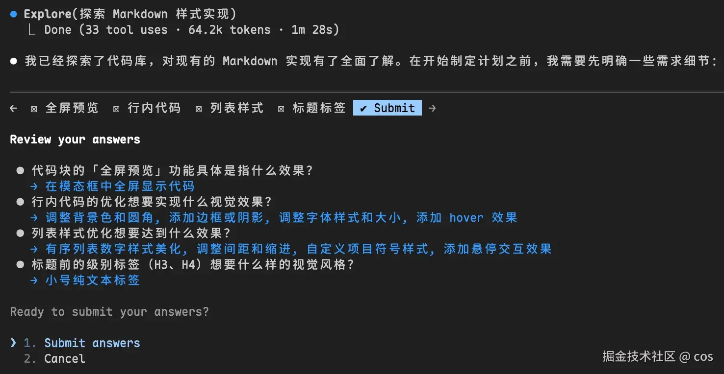 Plan Mode 会询问你一些问题,提交后再继续进行规划: