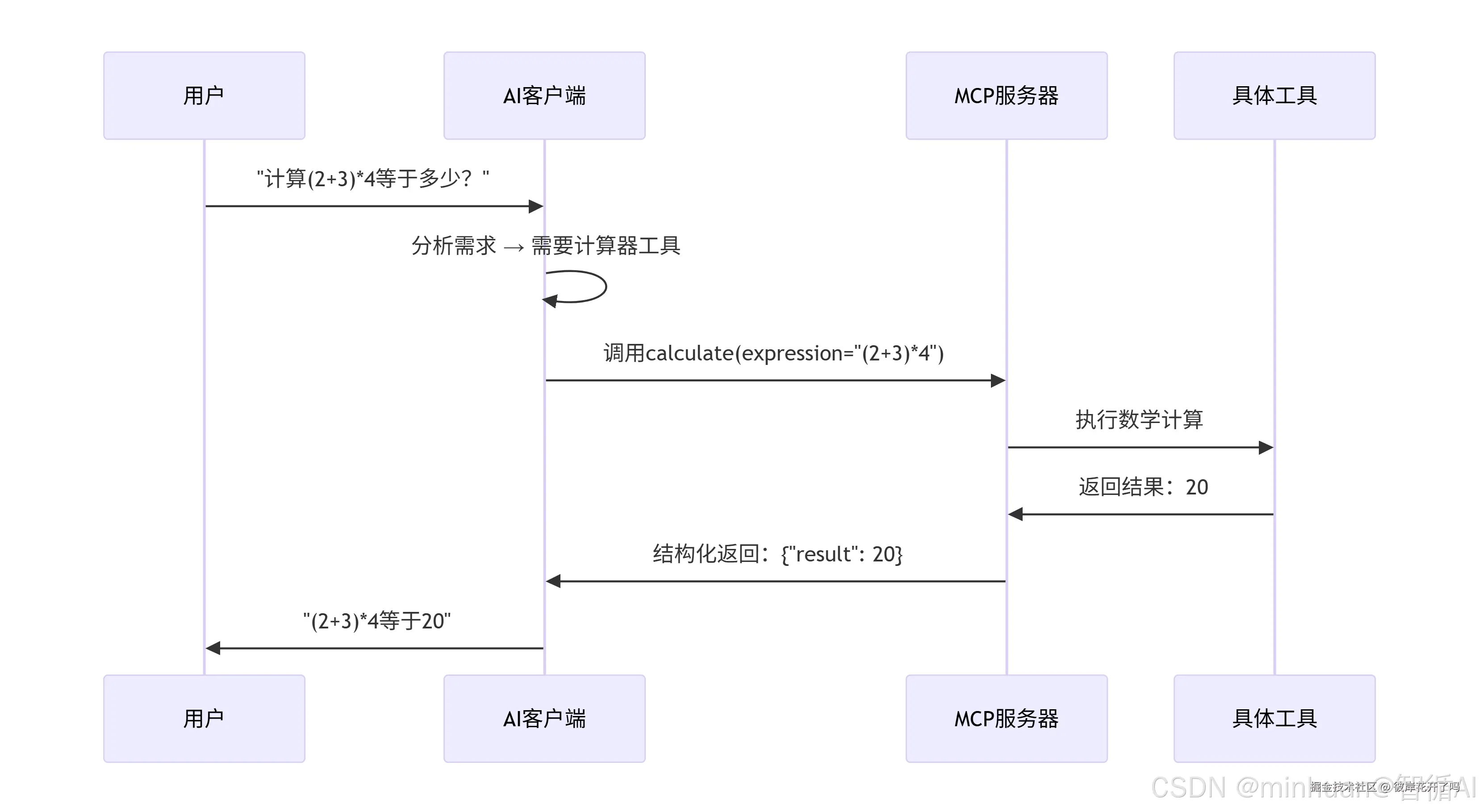 - AI调用工具:AI识别出需要计算,于是通过MCP协议向计算器工具发送请求:“请计算(2+3)*4”。