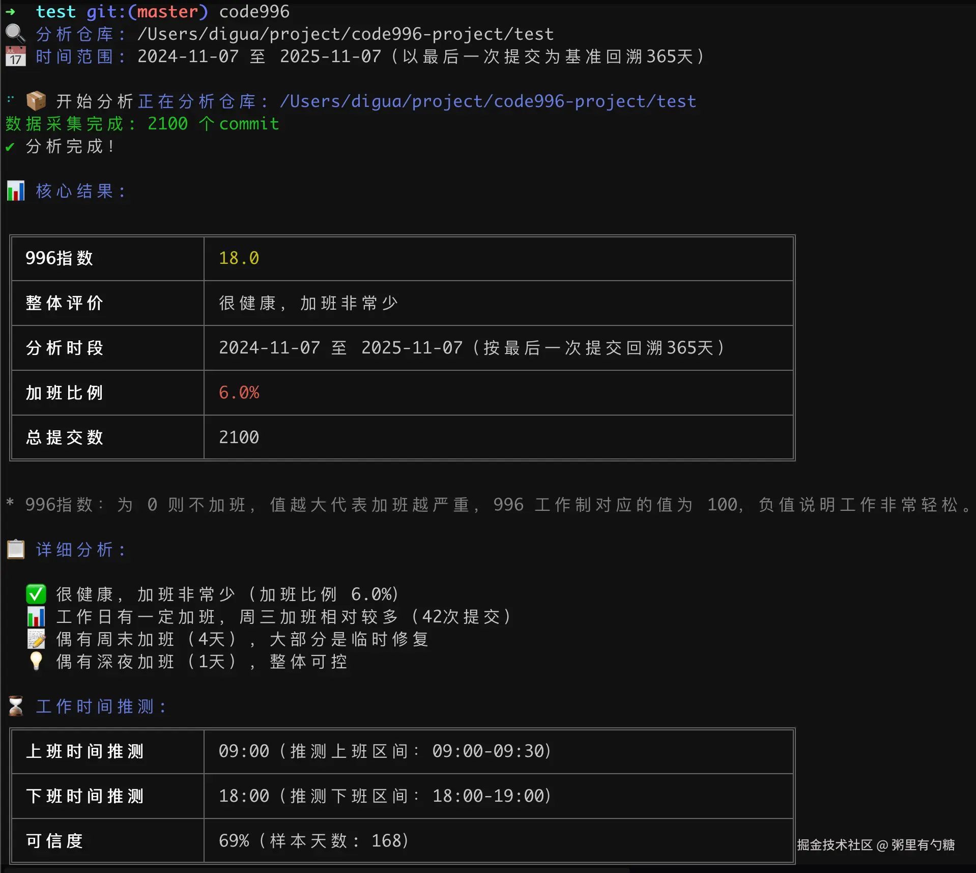 code996 是一个分析工具,它可以统计 Git 项目的 commit 时间分布,进而推导出项目的编码工作强度。