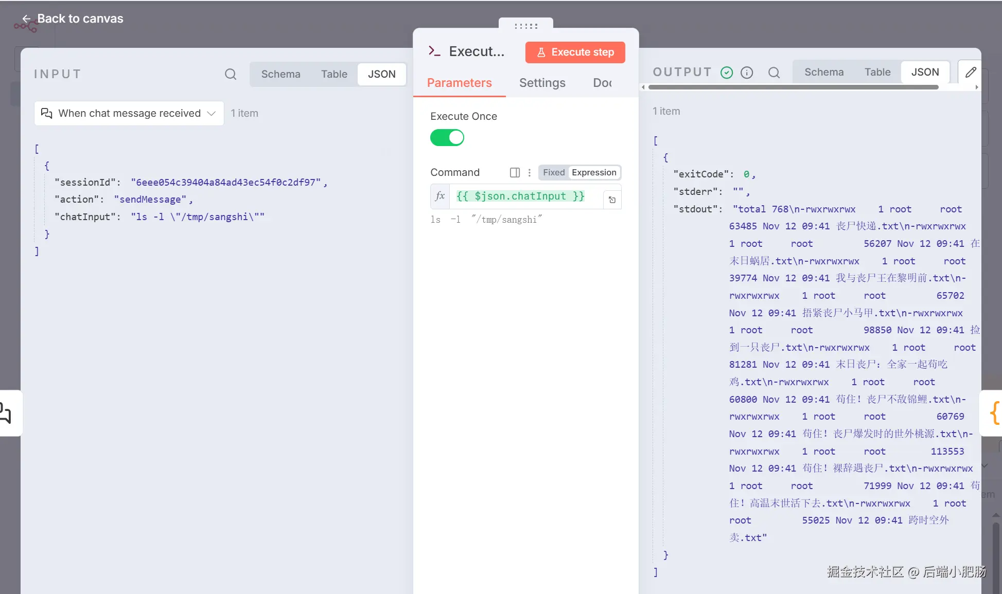Execute Command:开始节点出来后点击【+】新增Execute Command节点。 这个节点的作用是执行命令,如下图中所示在前置的chat节点传入了命令ls -l "/tmp/sangshi",那么这个节点就会执行这个命令去查看文件夹下的文件列表。