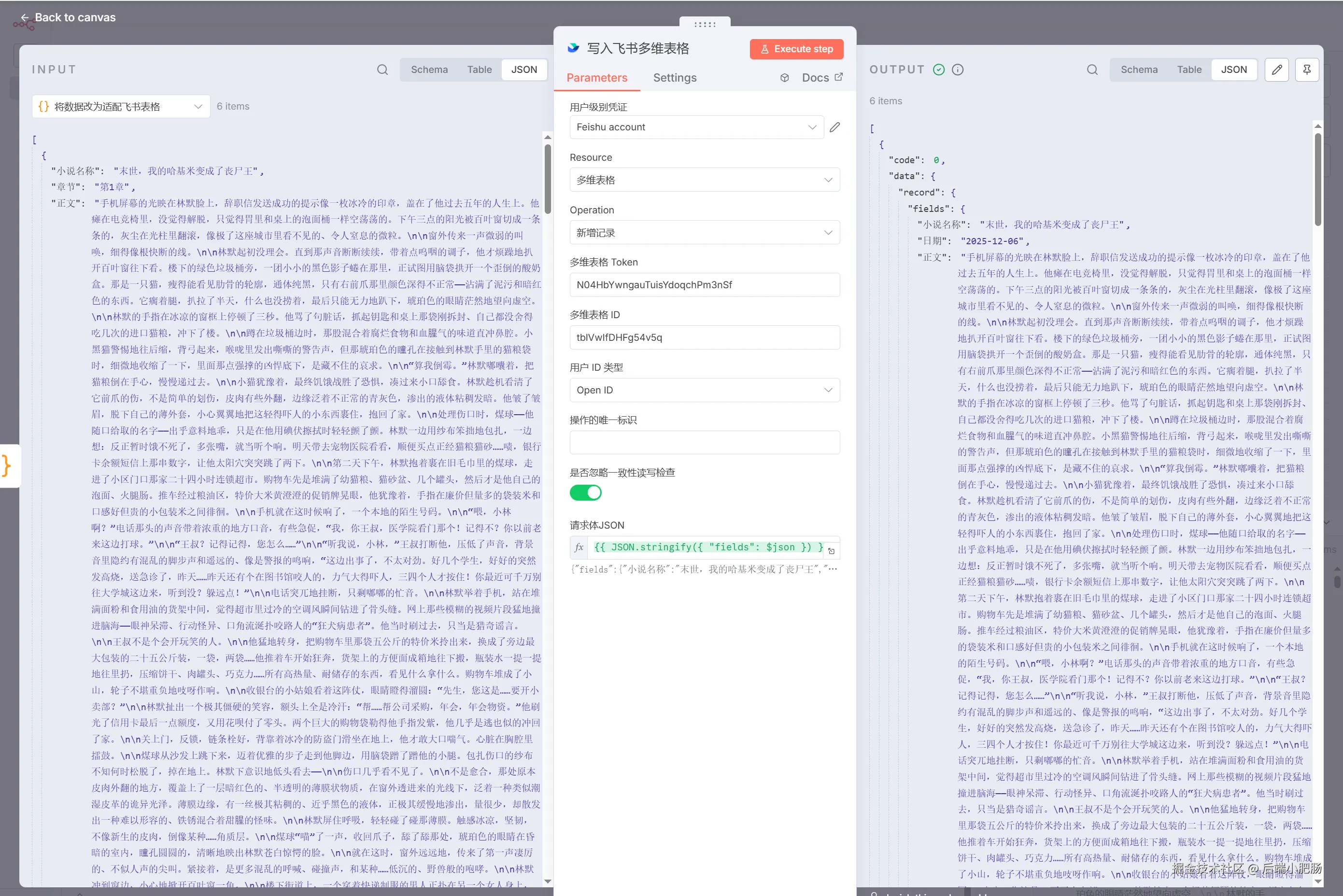 写入飞书工作流可以将小说分章节写入到飞书表格,这个工作流也比较适配我们实际应用生产。