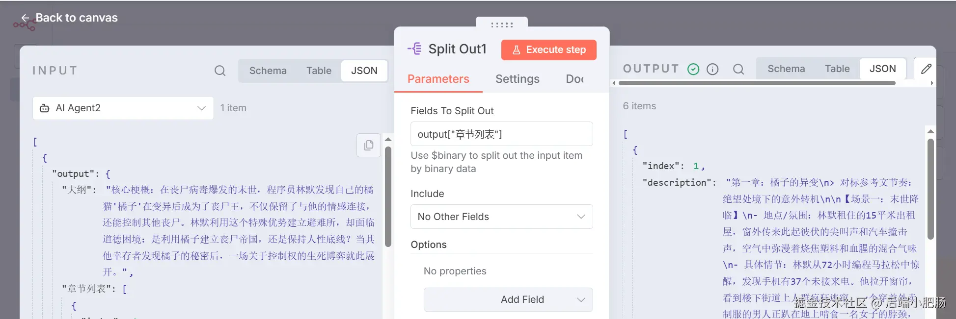 Split Out:编写大纲(AI Agent) 节点出来后点击【+】新增Split Out节点。 这个节点的作用是将前置节点生成的章节列表进行拆分,成为单独的章节元素。