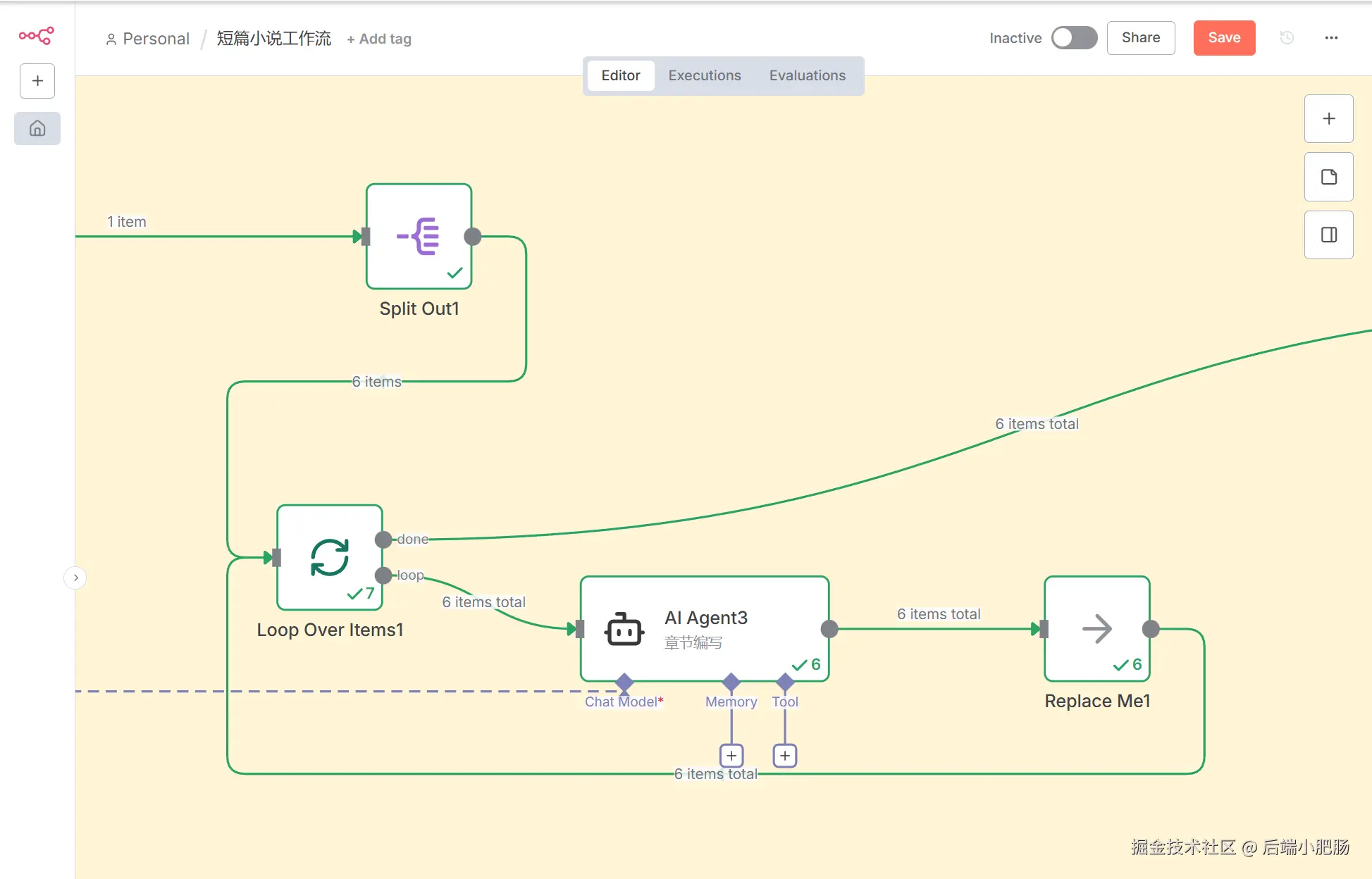 在循环中开启章节编写:Split Out节点出来后就进入了详细章节编写环境,下图中基于循环结合AI Agent完成了每个章节的编写。