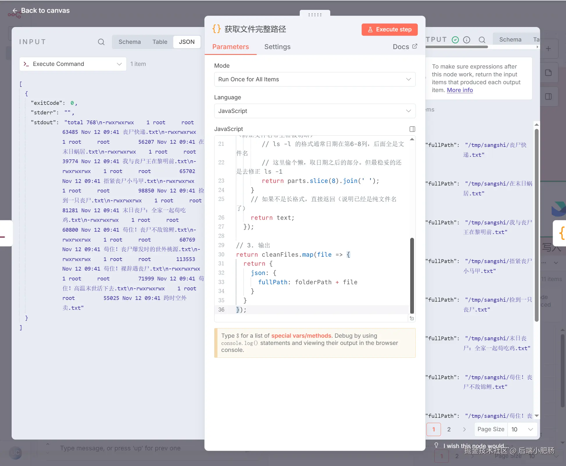 获取文件路径(代码):Execute Command节点节点出来后点击【+】新增Code in JavaScript 节点。这个节点的作用是结合代码获取每个小说文件的完整路径。